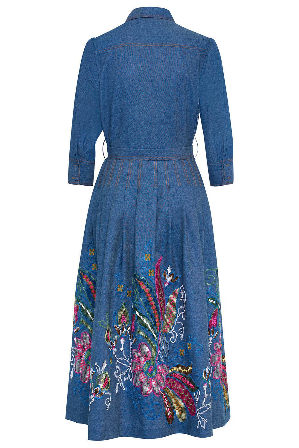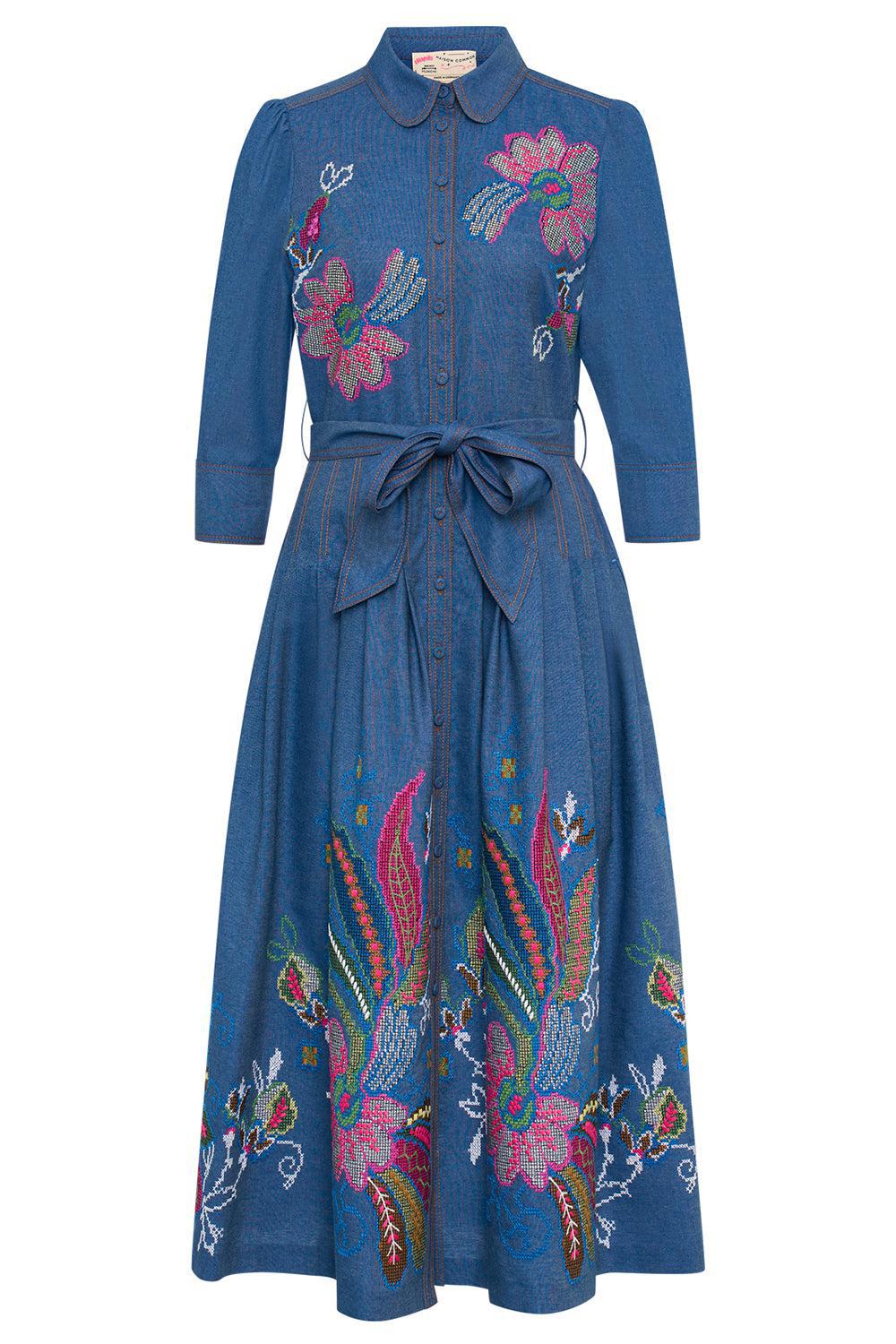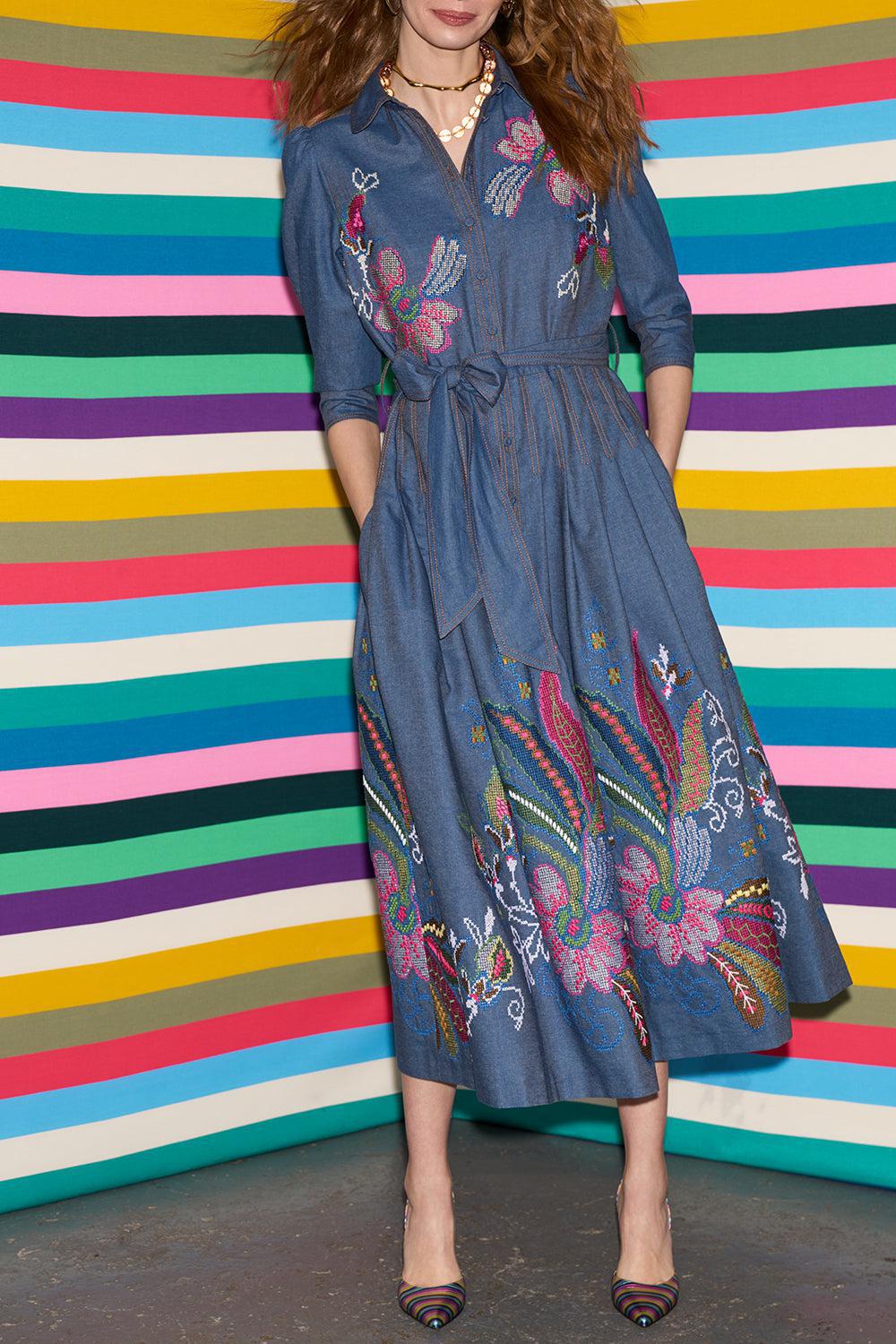 Maison Common belted embroidered dress in blue multi.
