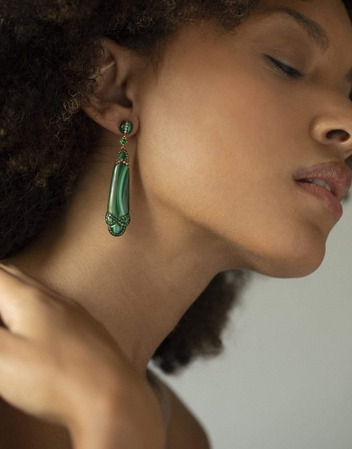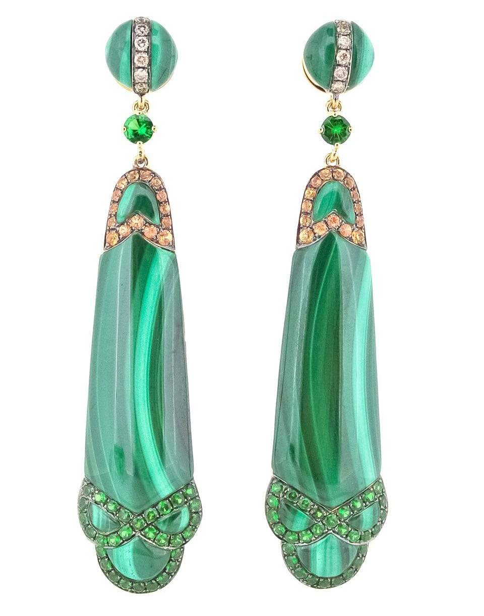 Wendy Yue Malachite Earrings. Elegant malachite slice earrings accented by sapphires, diamonds, and tsavorite can be worn from day to night.
