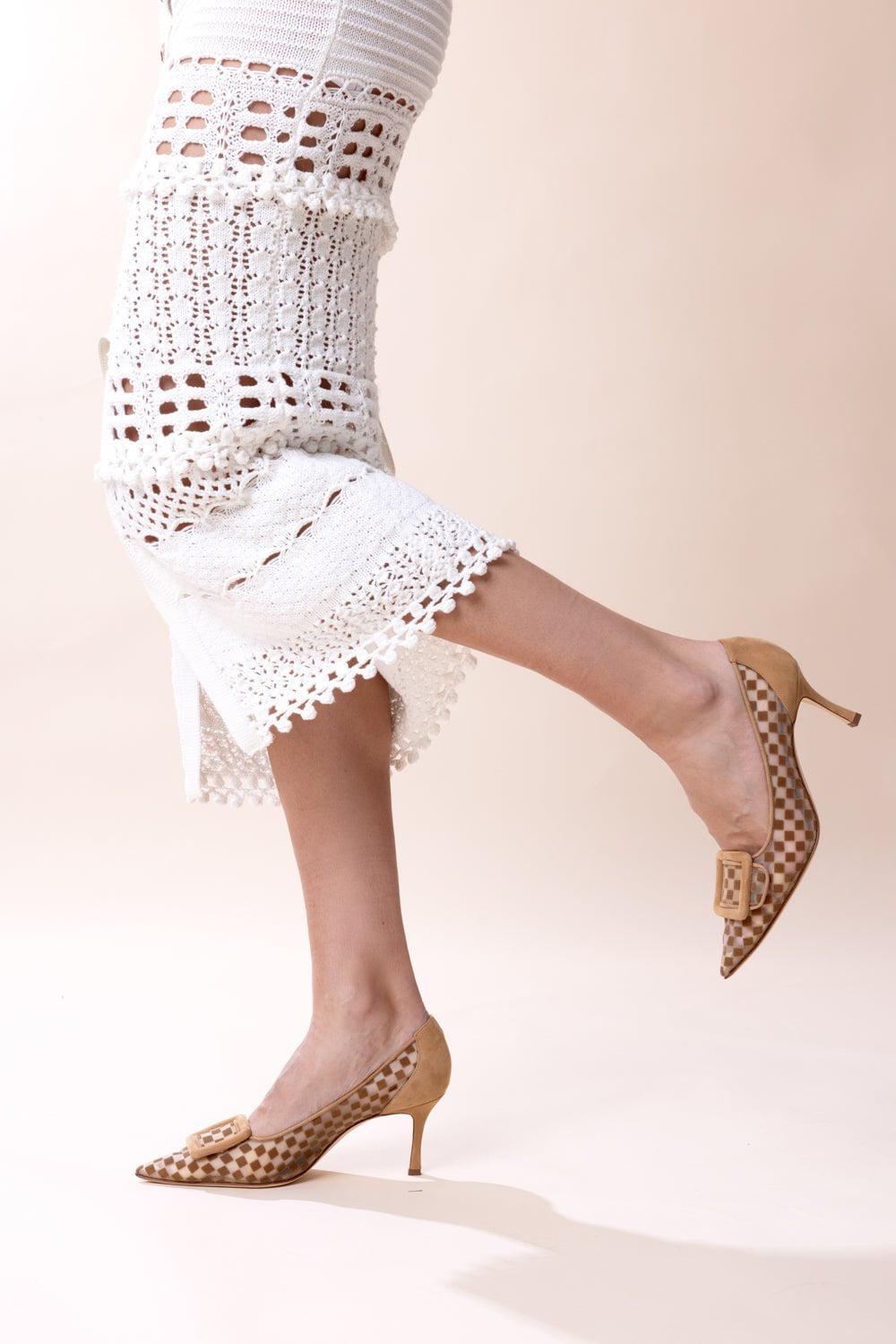 Manolo Blahnik maysale pump in medium brown mesh/white.