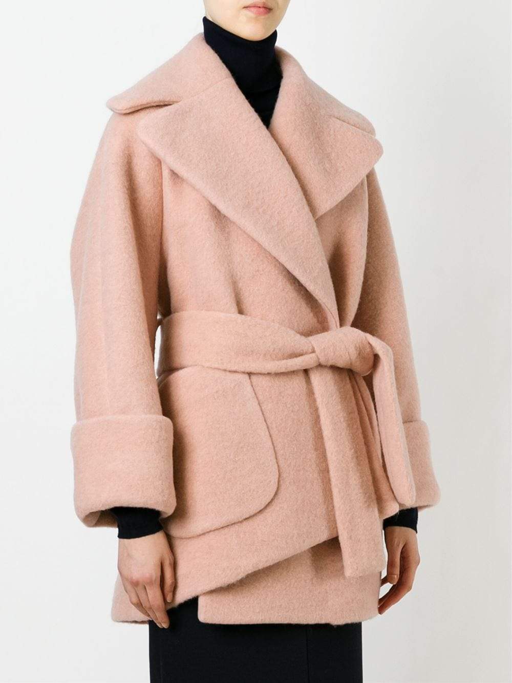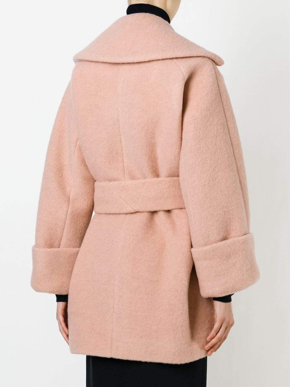 Large Lapel With Adjustable Wide Tie Belt, Large Belt Loops, Rolled Cuffs, And Loose-Fitting Silhouette