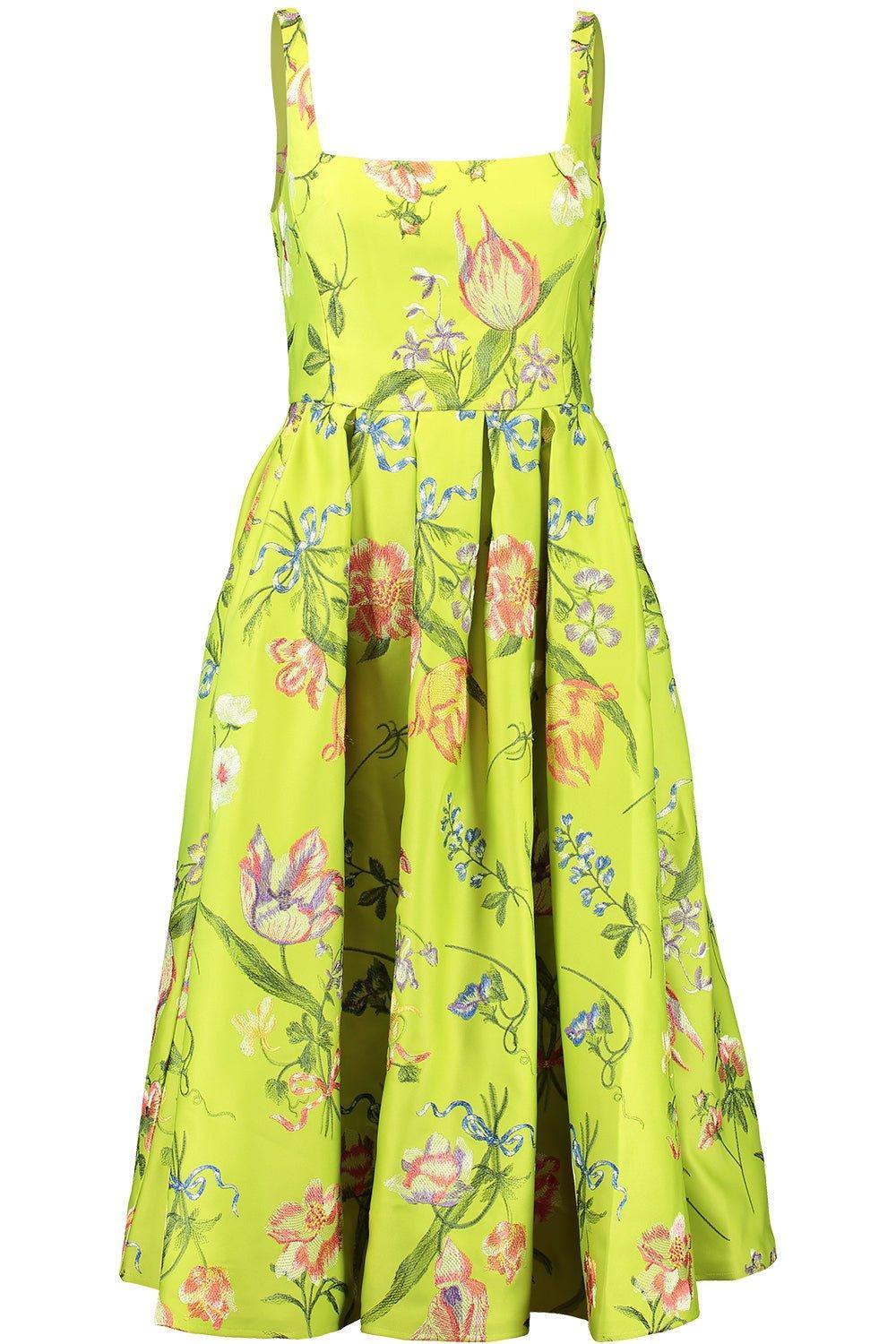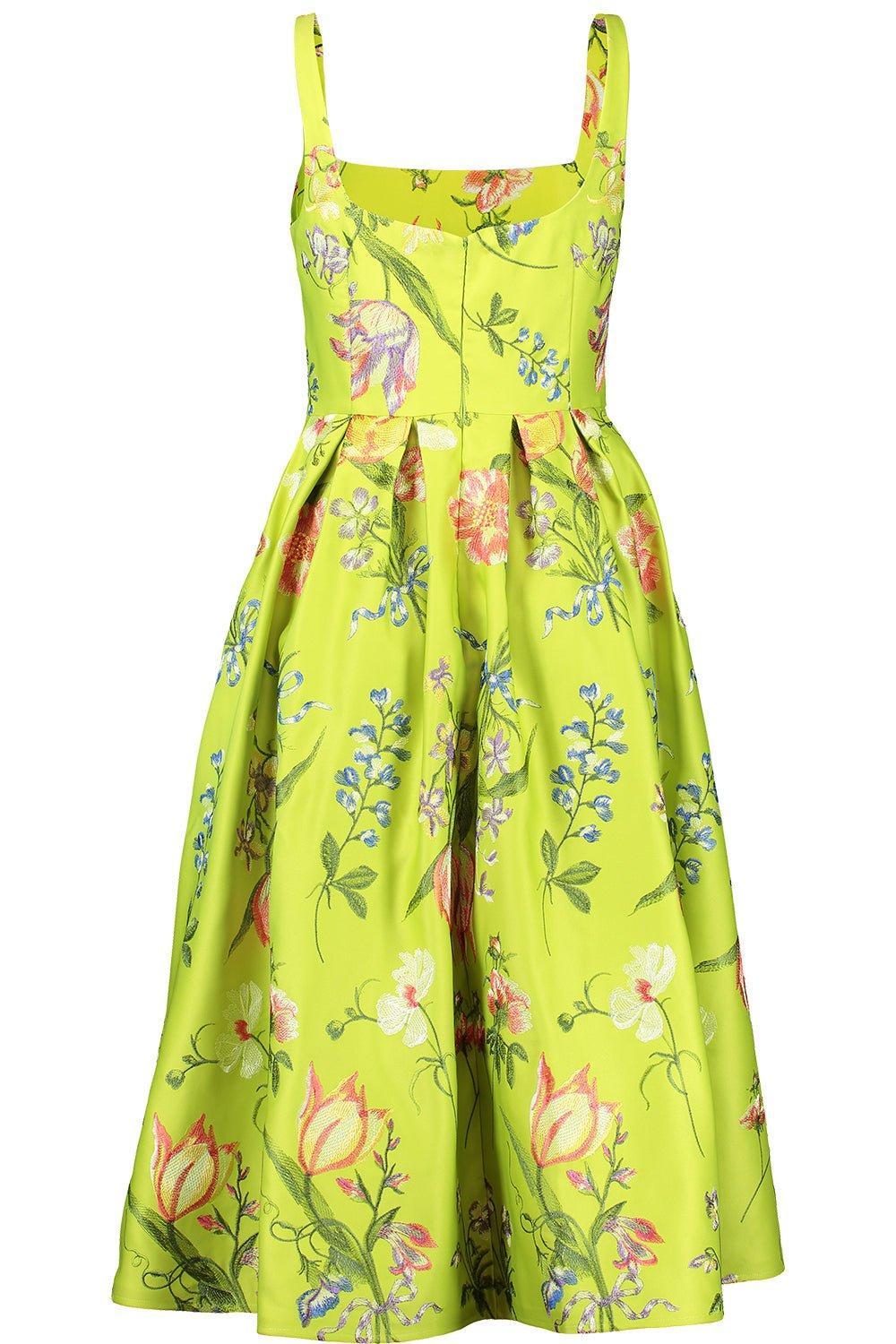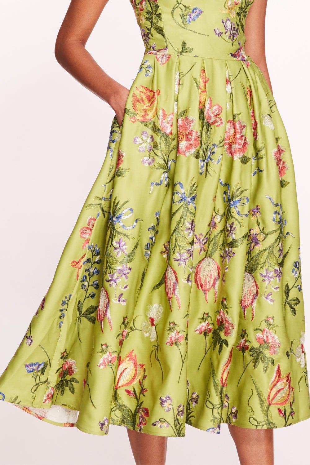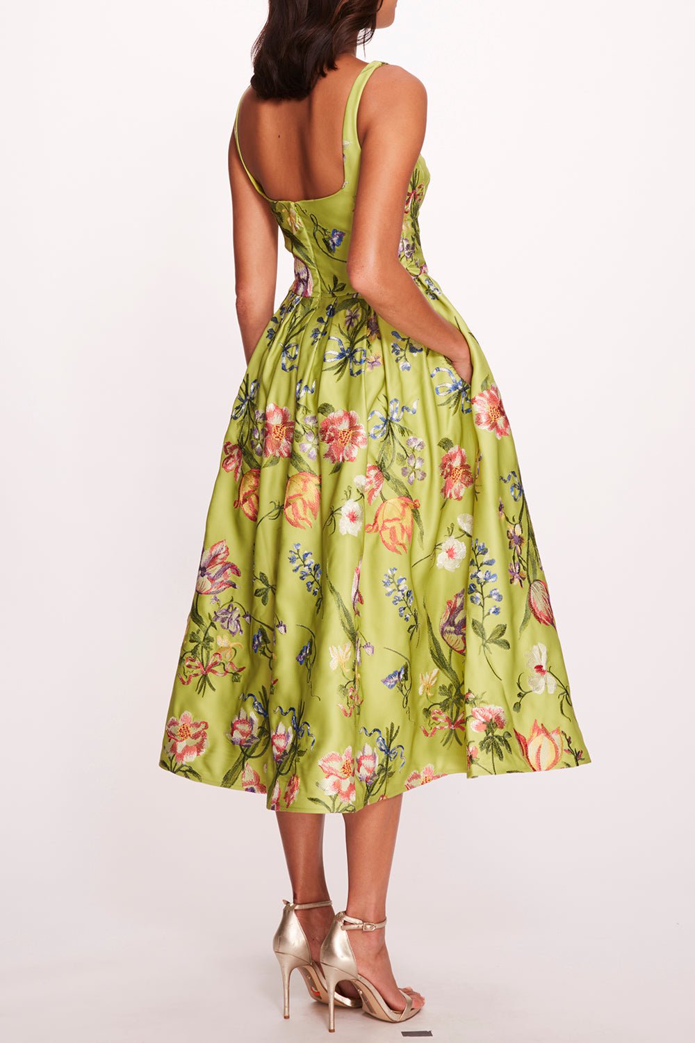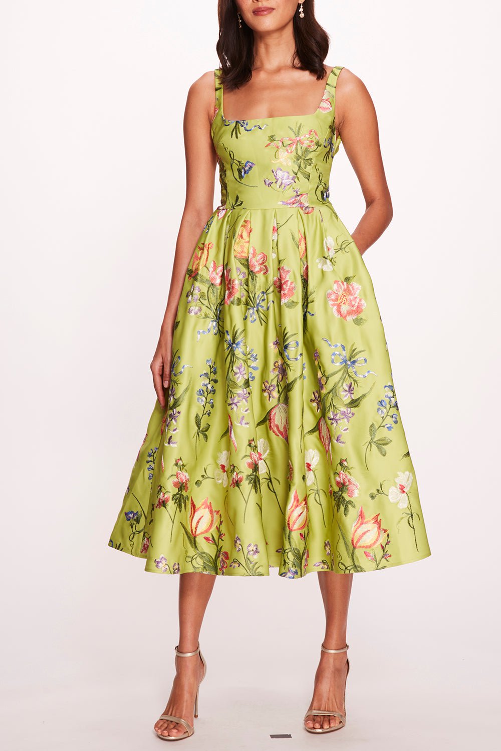 Marchesa Notte sleeveless midi dress in spring green multi.