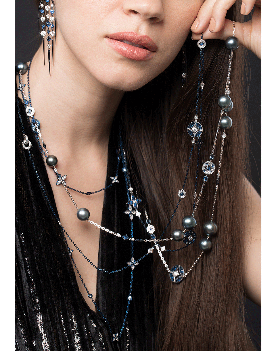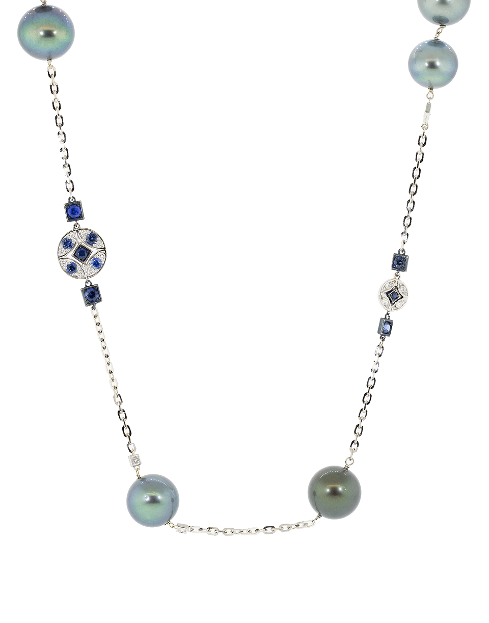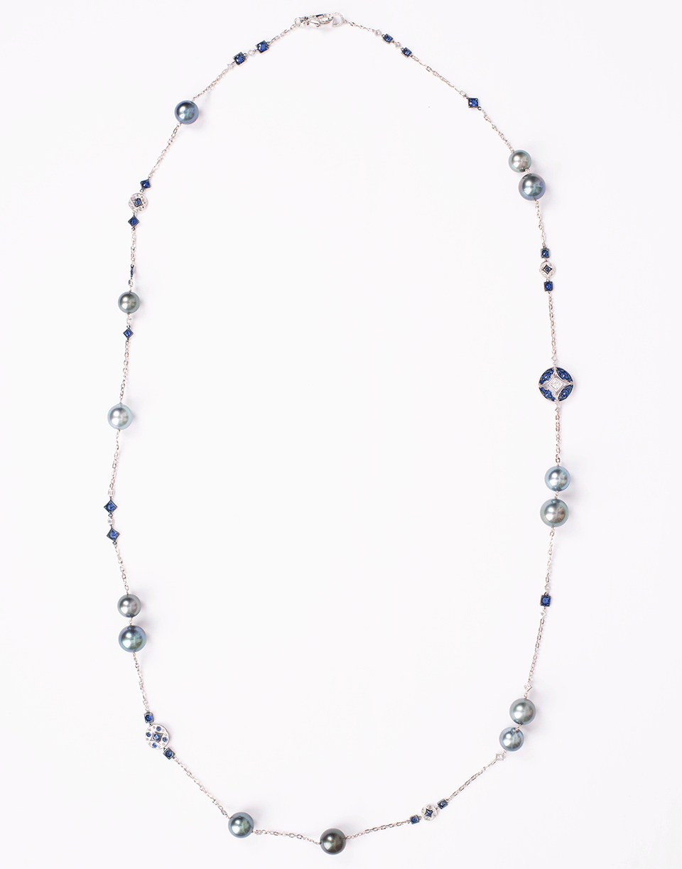 Mariani Mare Collection Tahitian pearl necklace with blue sapphires and white diamonds set in 18k white gold.
