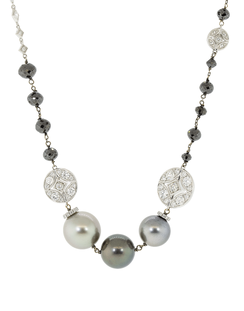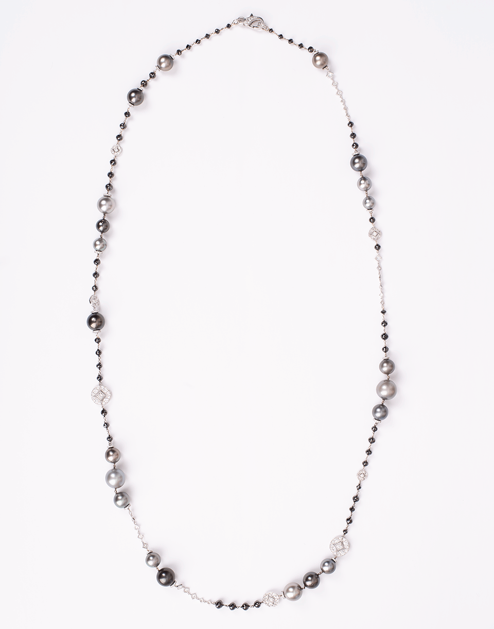Mariani Mare Collection Tahitian pearl and black diamond bead necklace with with station white diamonds set in 18k white gold.