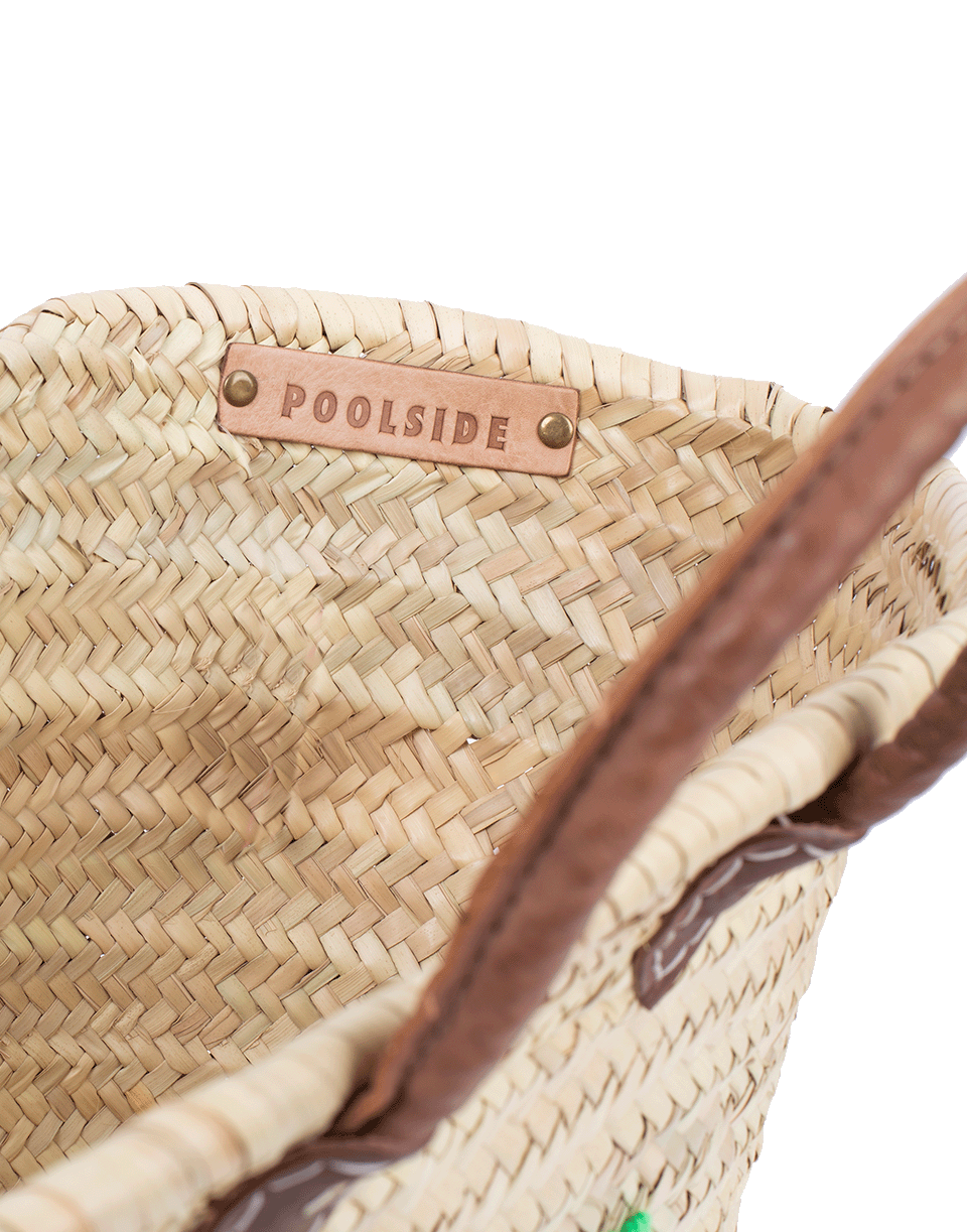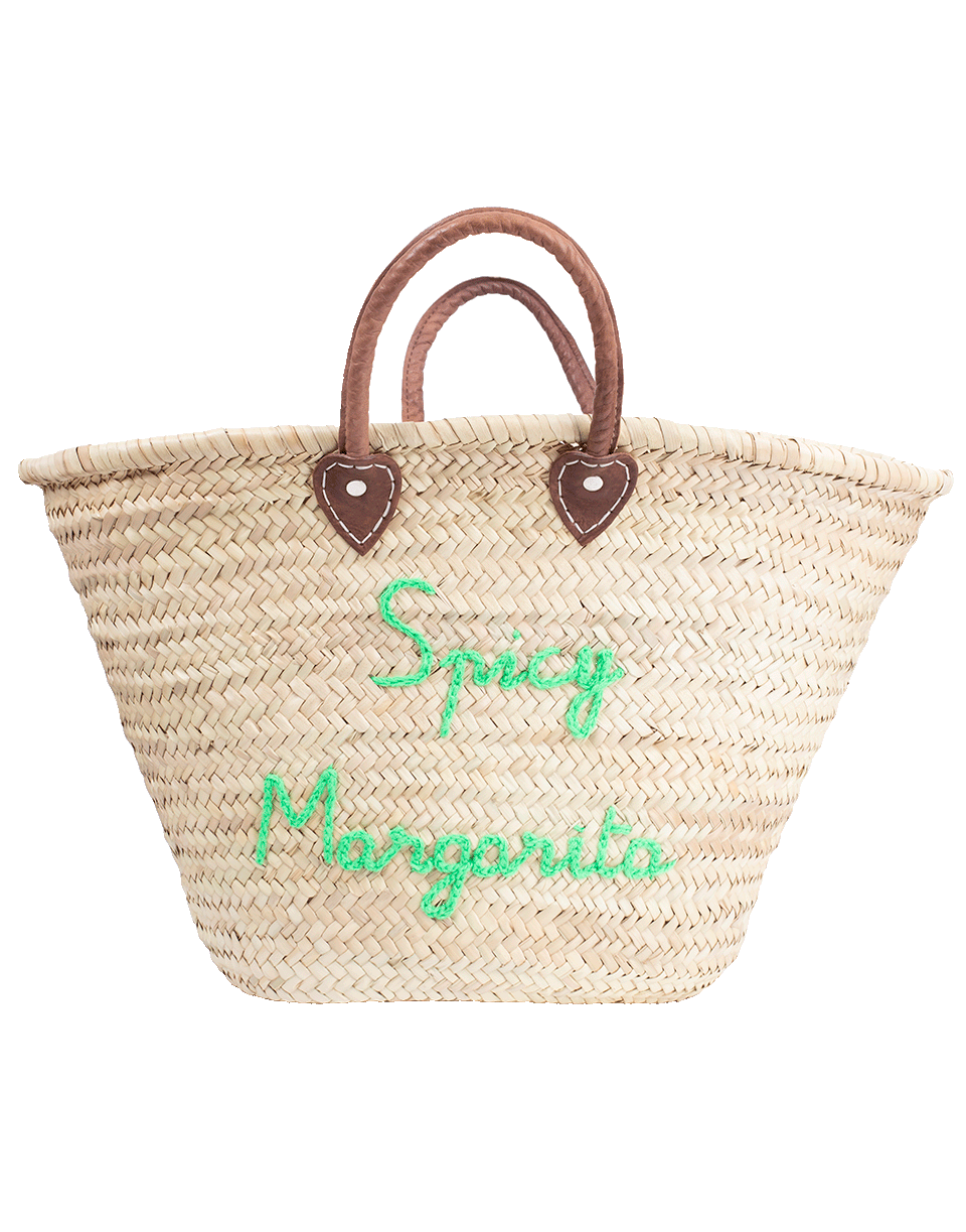Spicy Margarita top handle tote by Poolside. Handwoven in Morocco, this straw tote features a large open main compartment, green yarn script embroidery and two top handles.