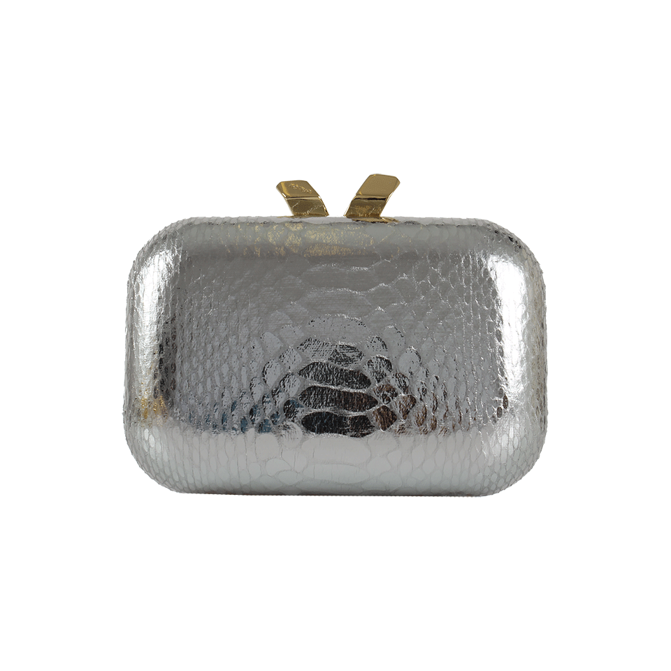 Less is more with this margo snake clutch by Kotur. Carry your iPhone and little else within this metallic snake bag with semi-precious stone clasp in gleaming fashion. Magnetic Closure 5.5” x 4” x 1.75” 20” Chain Strap Available in Silver