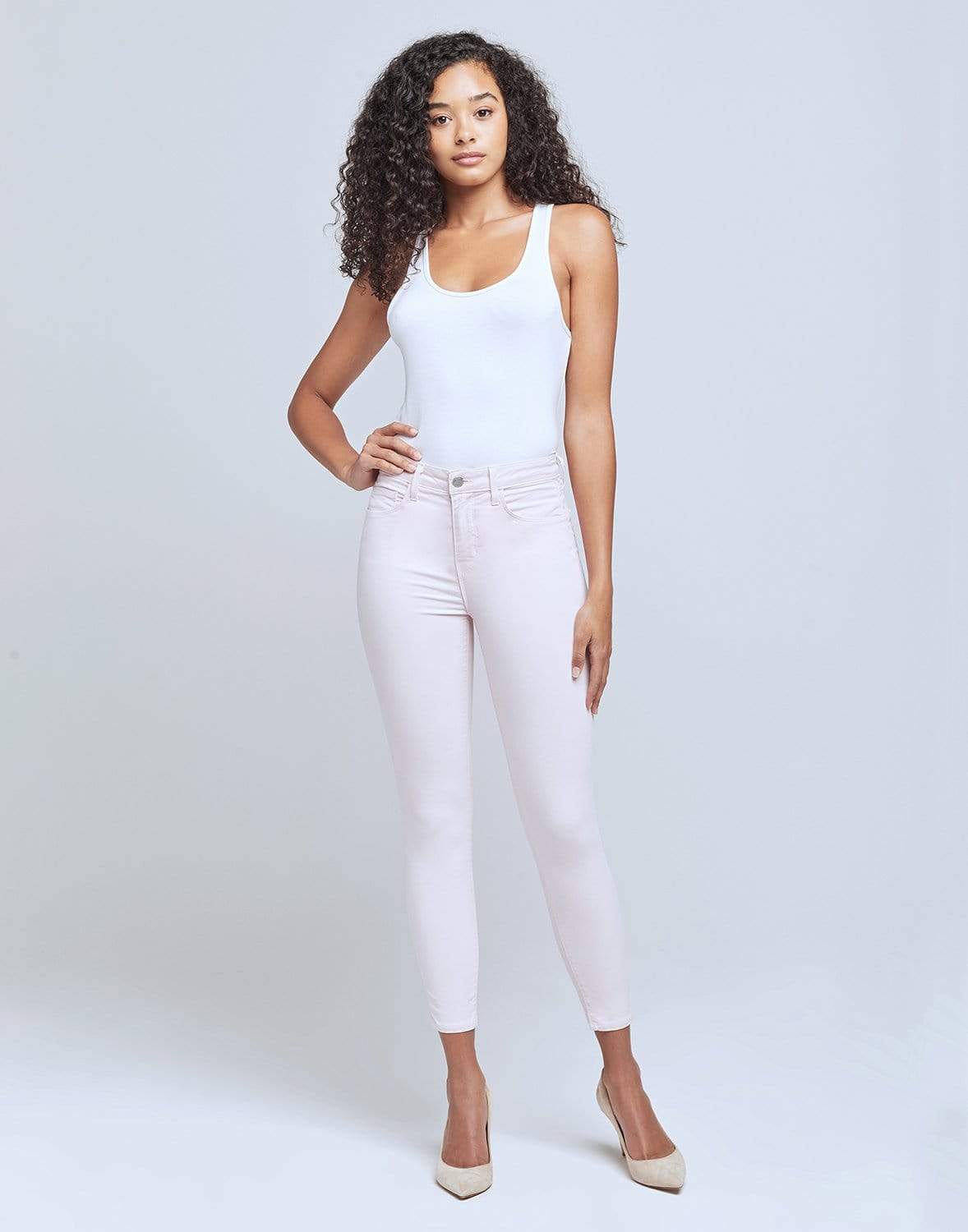 L'Agence signature high-rise skinny jean crafted from premium, luxurious stretch denim in true, saturated black. Tapered leg hugs from hip to ankle, while the contoured waistband defines and slims the natural waist. High-recovery fabric holds its shape, smoothing the silhouette without sacrificing comfort.
