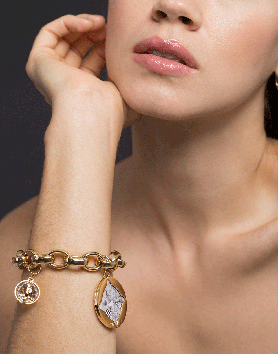Chunky 18k yellow gold hinged link charm bracelet from Monica Rich Kosann. Wear it on its own or add a few charms to further decorate your wrist.