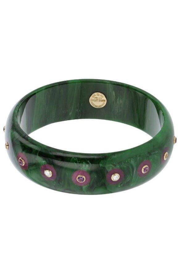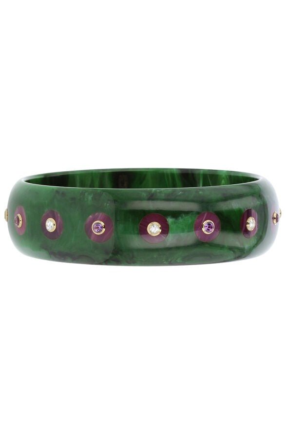Mark Davis amethyst white topaz green bakelite bangle in yellow gold.