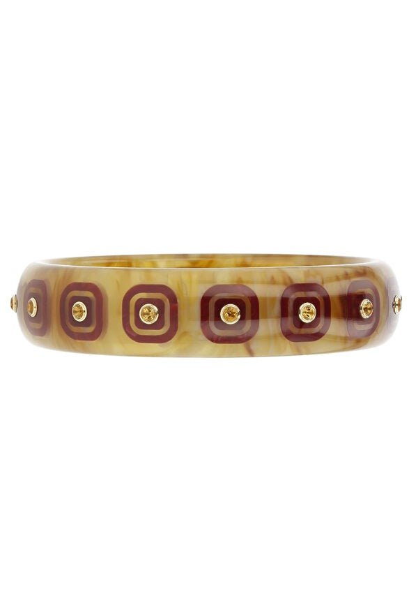 Mark Davis citrine tortoise bakelite bangle in yellow gold.