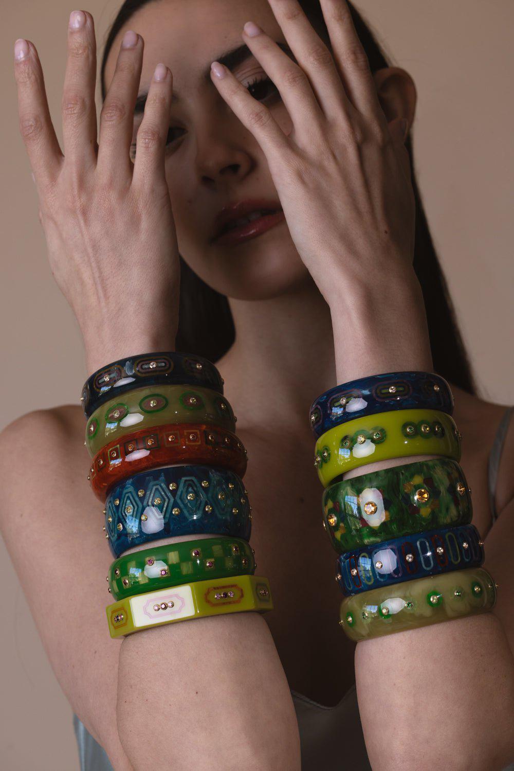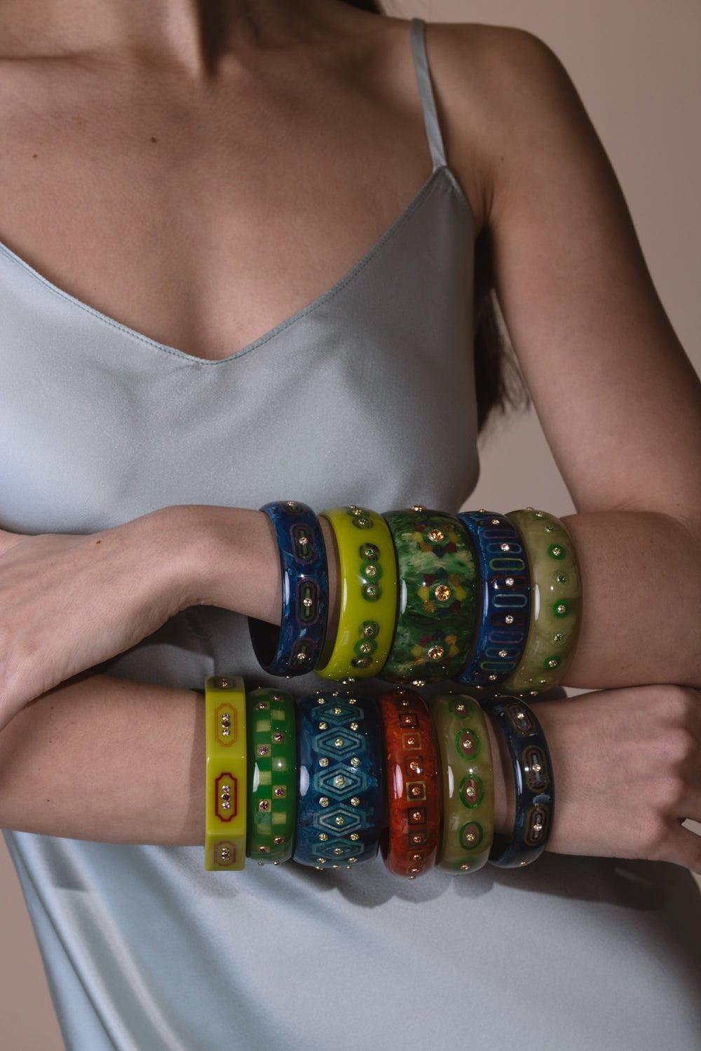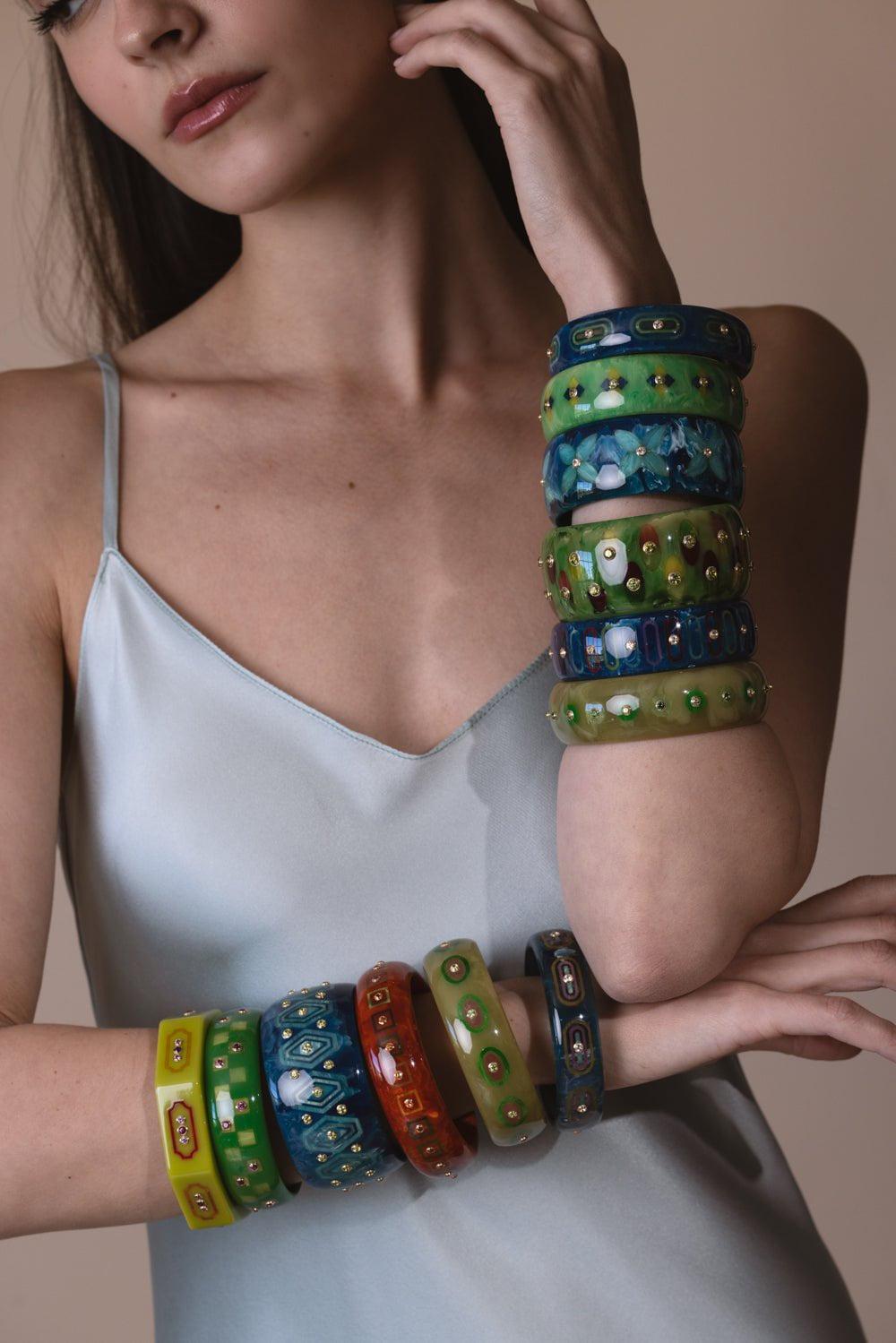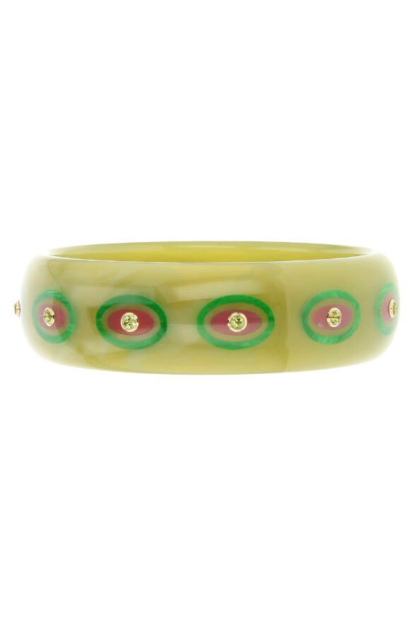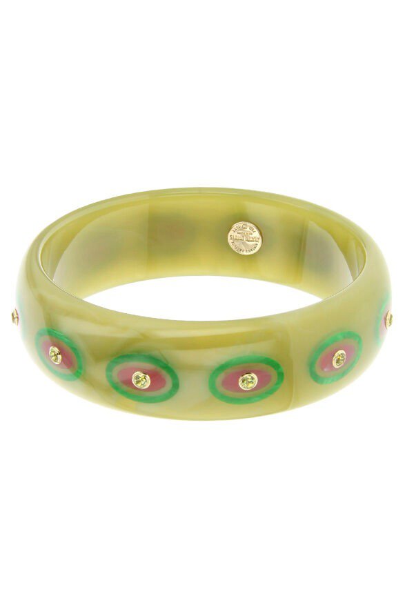 Mark Davis peridot green bakelite bangle in yellow gold.
