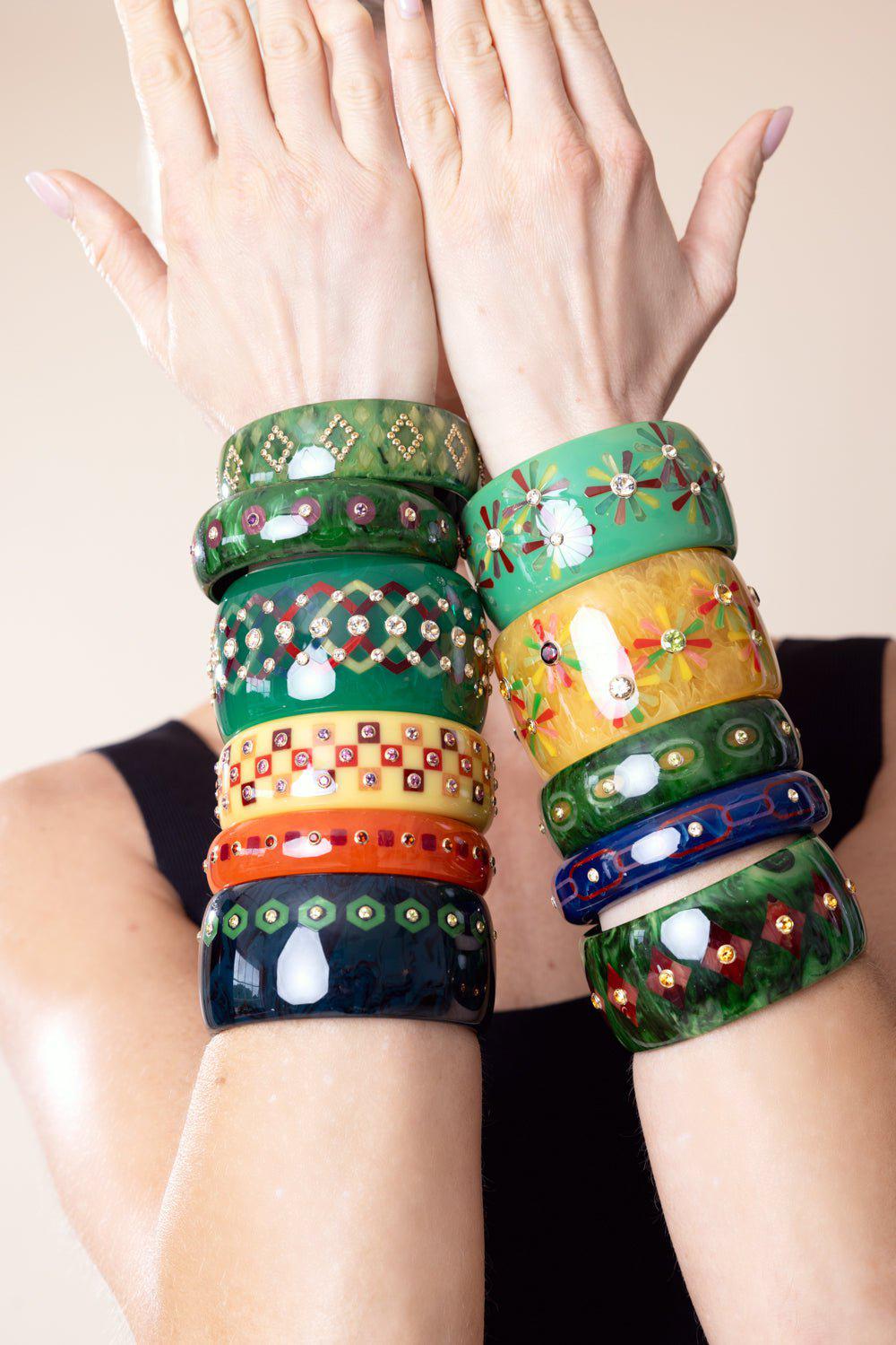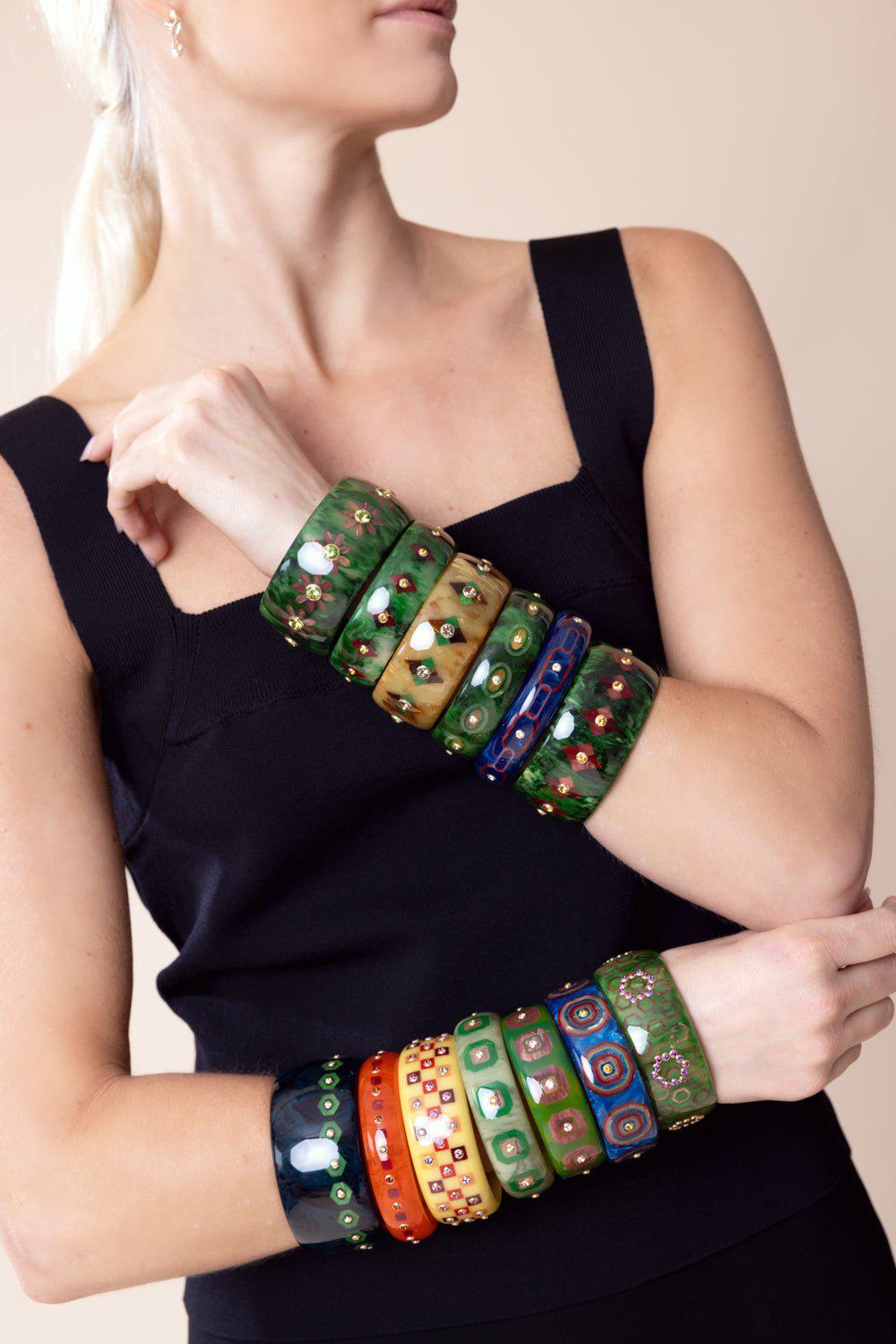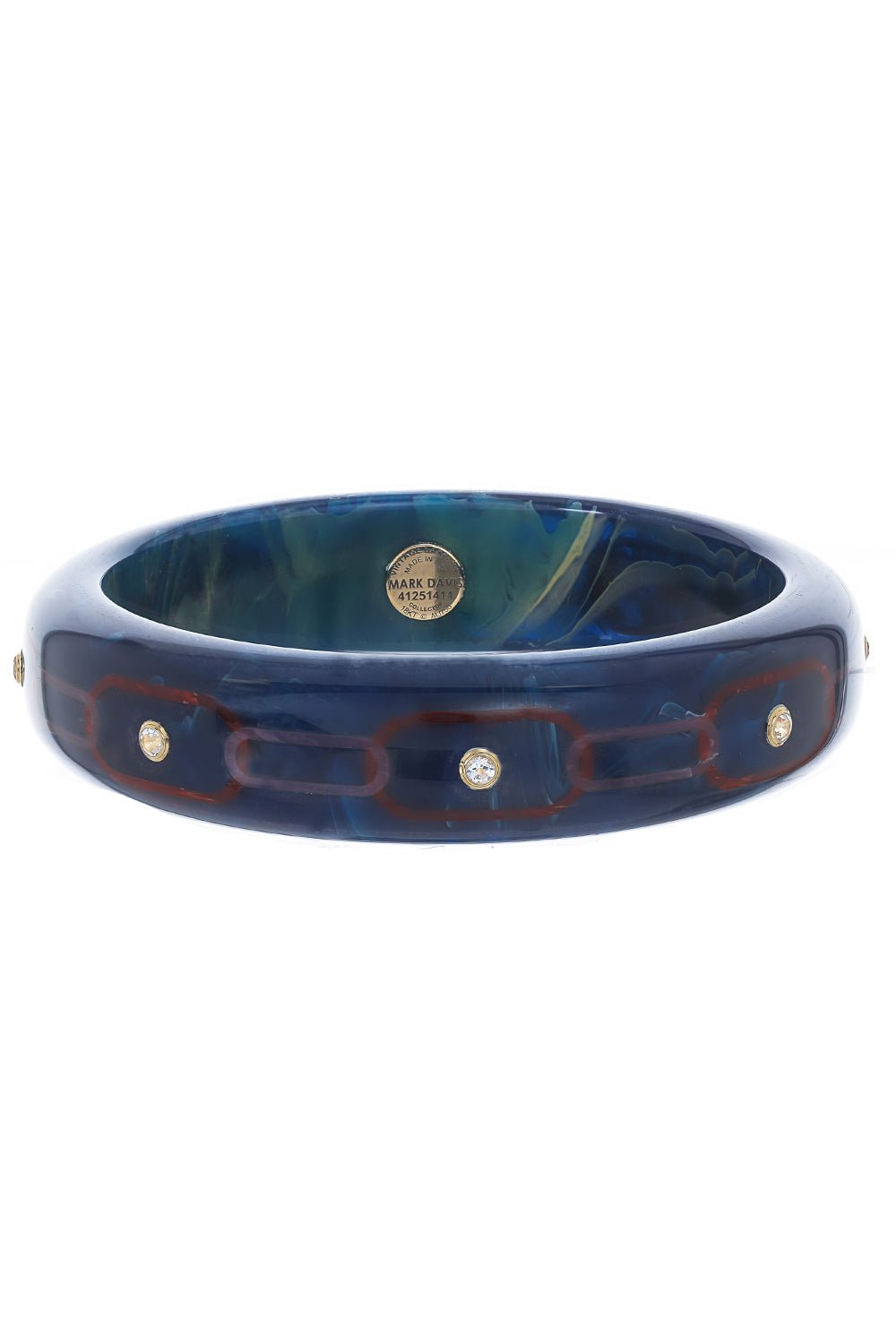Mark Davis white topaz blue bakelite bangle in yellow gold.