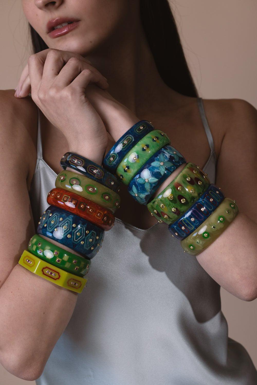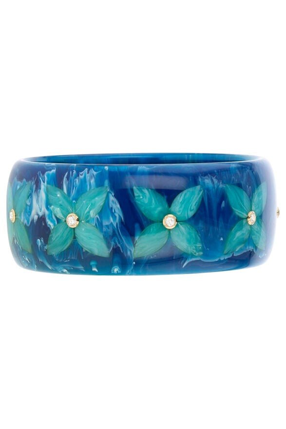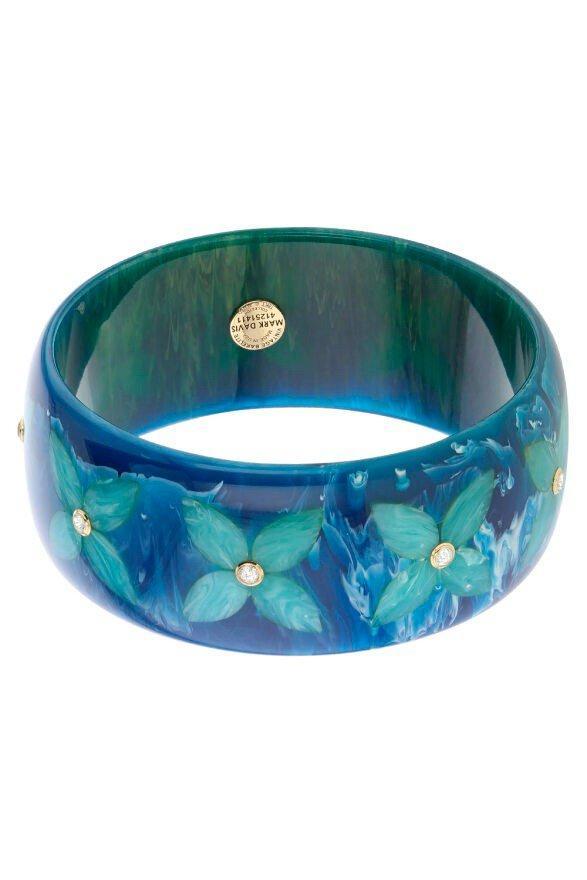 Mark Davis white topaz blue floral bakelite bangle in yellow gold.