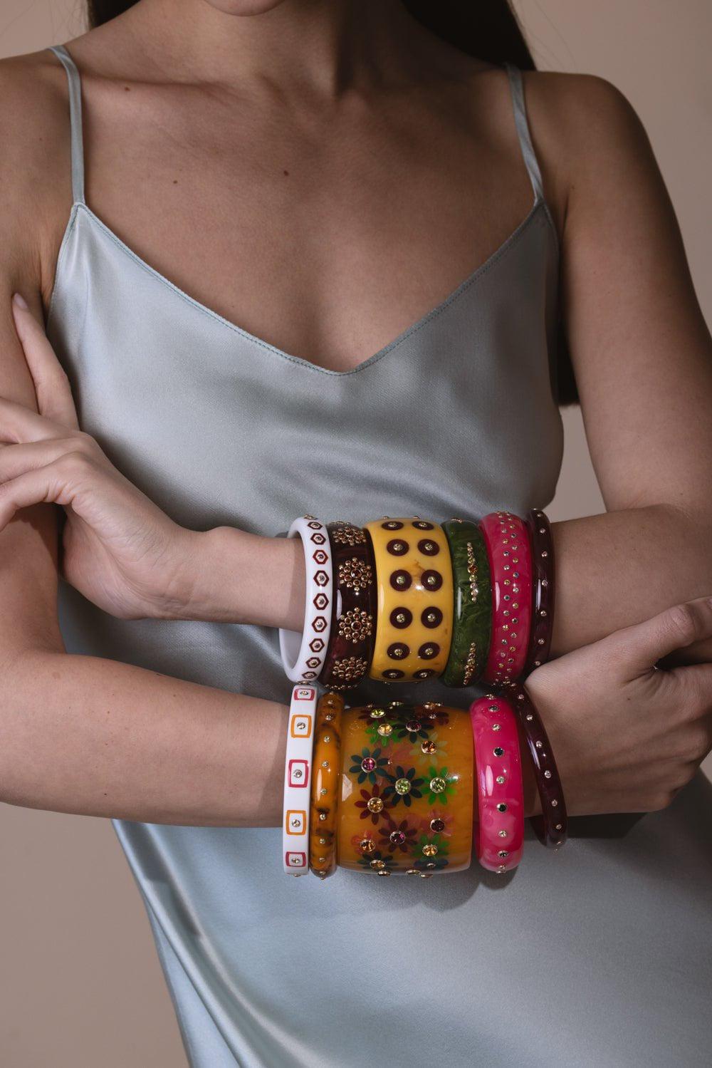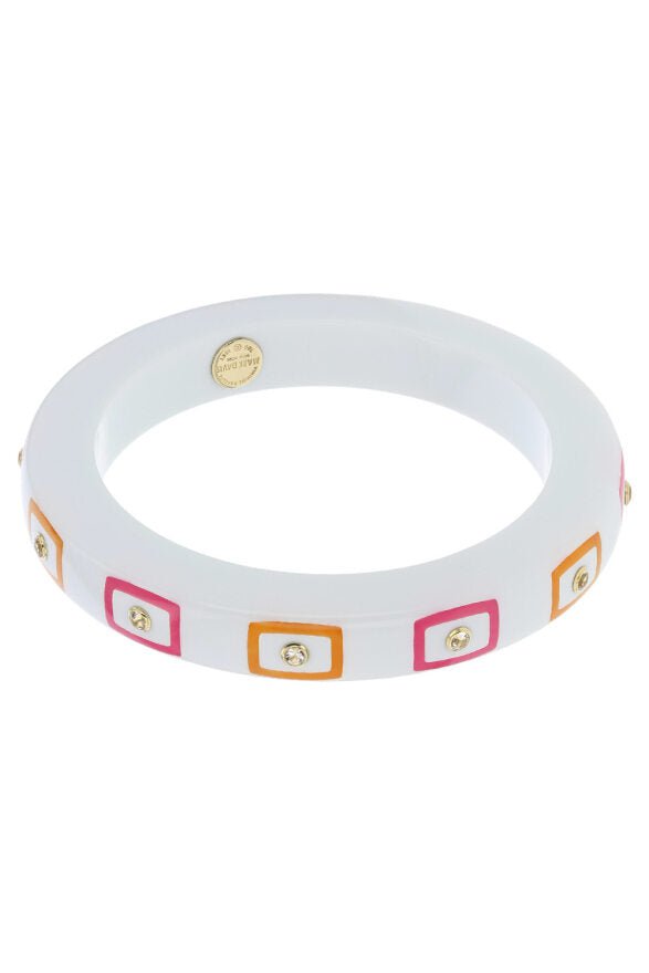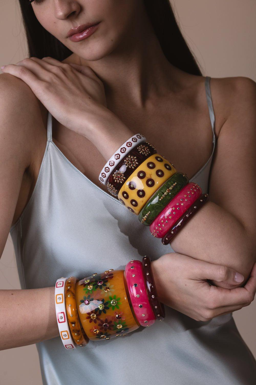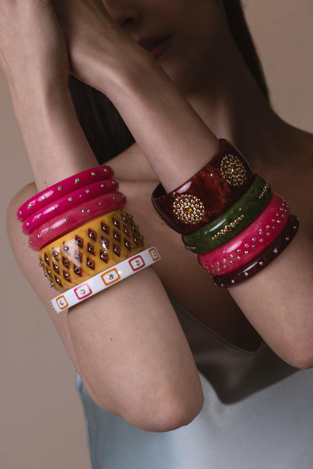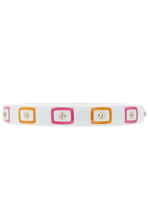 Mark Davis white topaz pink orange bakelite bangle in yellow gold.