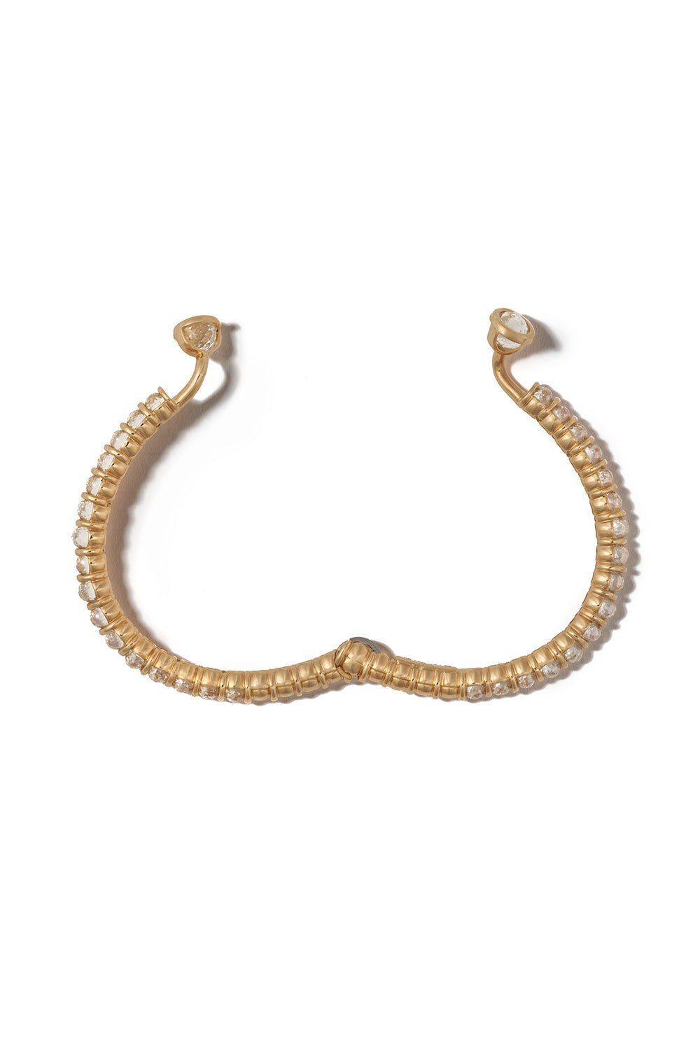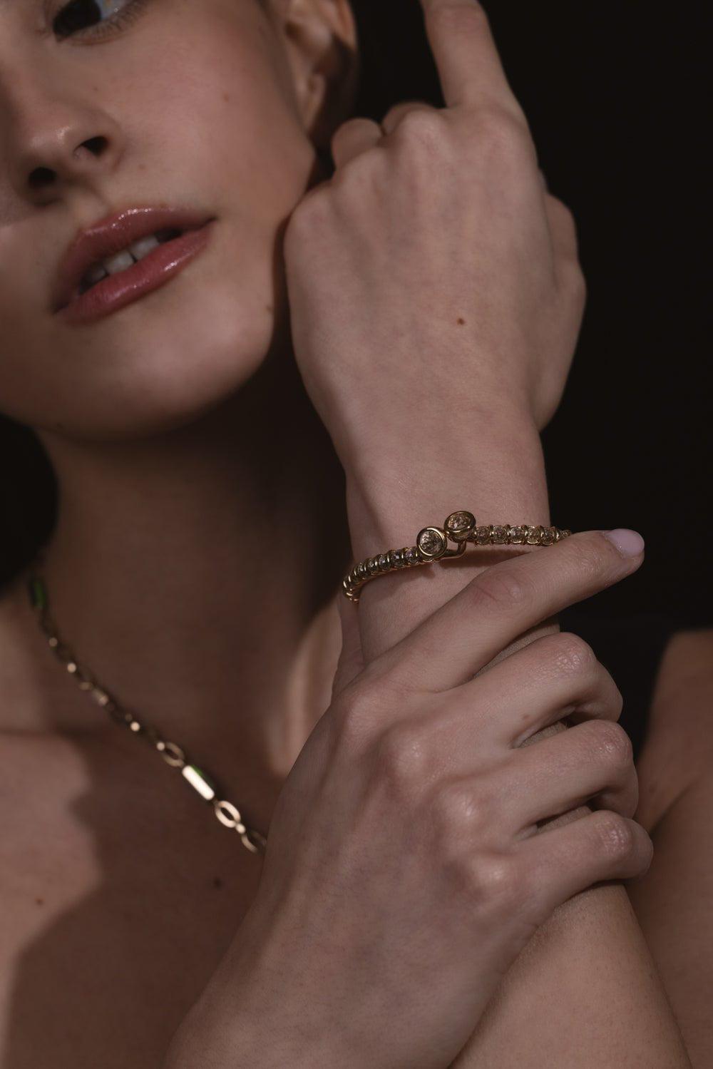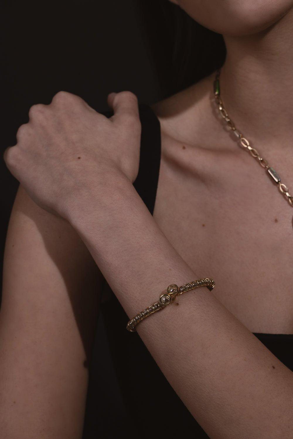 Marla Aaron rolling spheres diamond cuff bracelet in yellow gold.