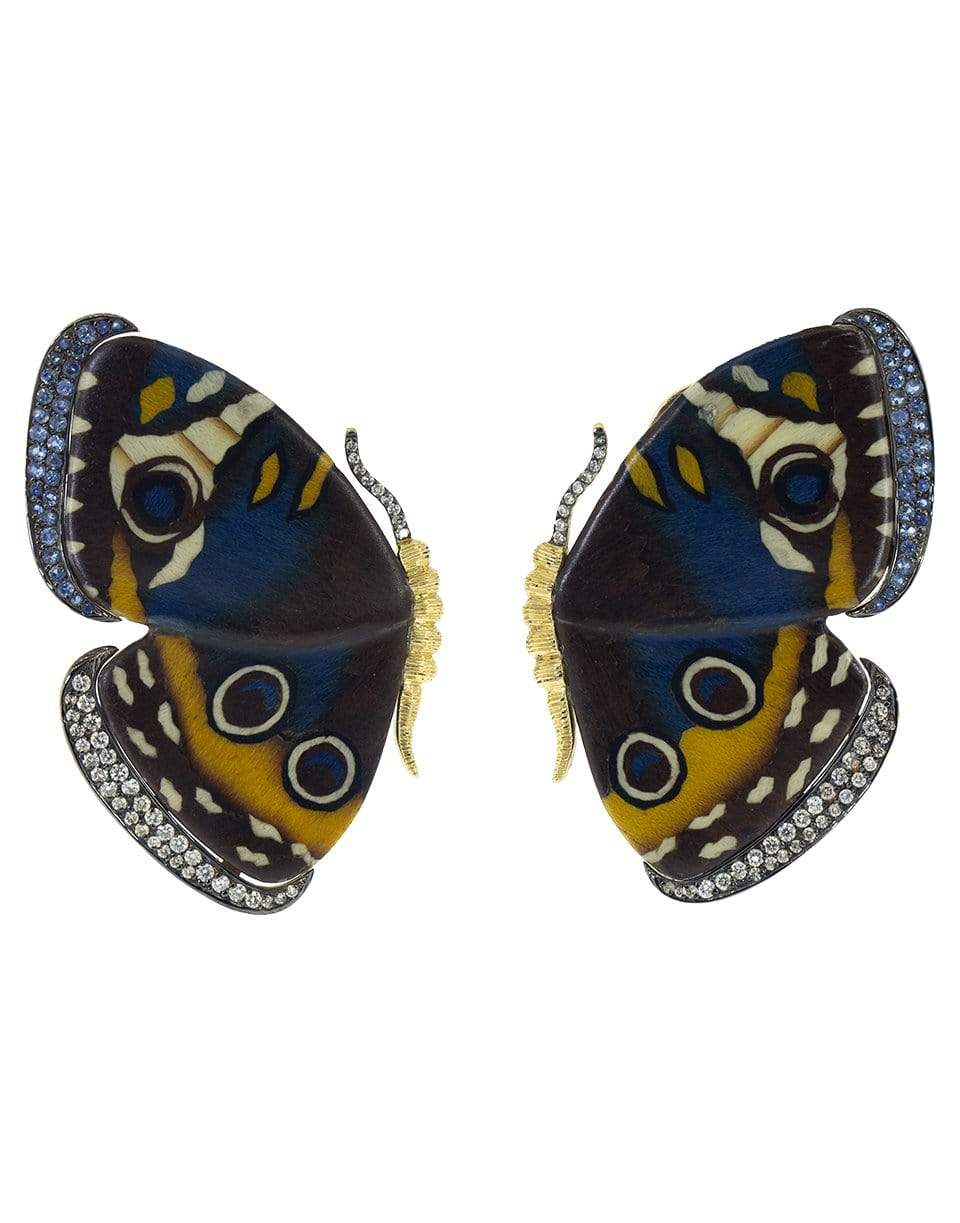 Marquetry Butterfly Earrings from Silvia Furmanovich with light brown diamonds and blue sapphires set in 18k yellow gold. For pierced ears.