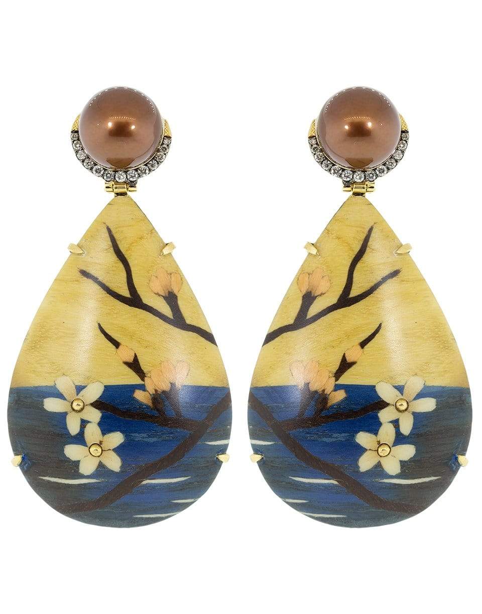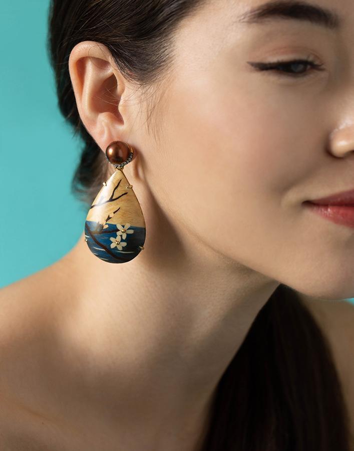 Silvia Furmanovich marquetry cherry blossom teardrop earrings with light brown diamonds and brown pearls. For pierced ears.