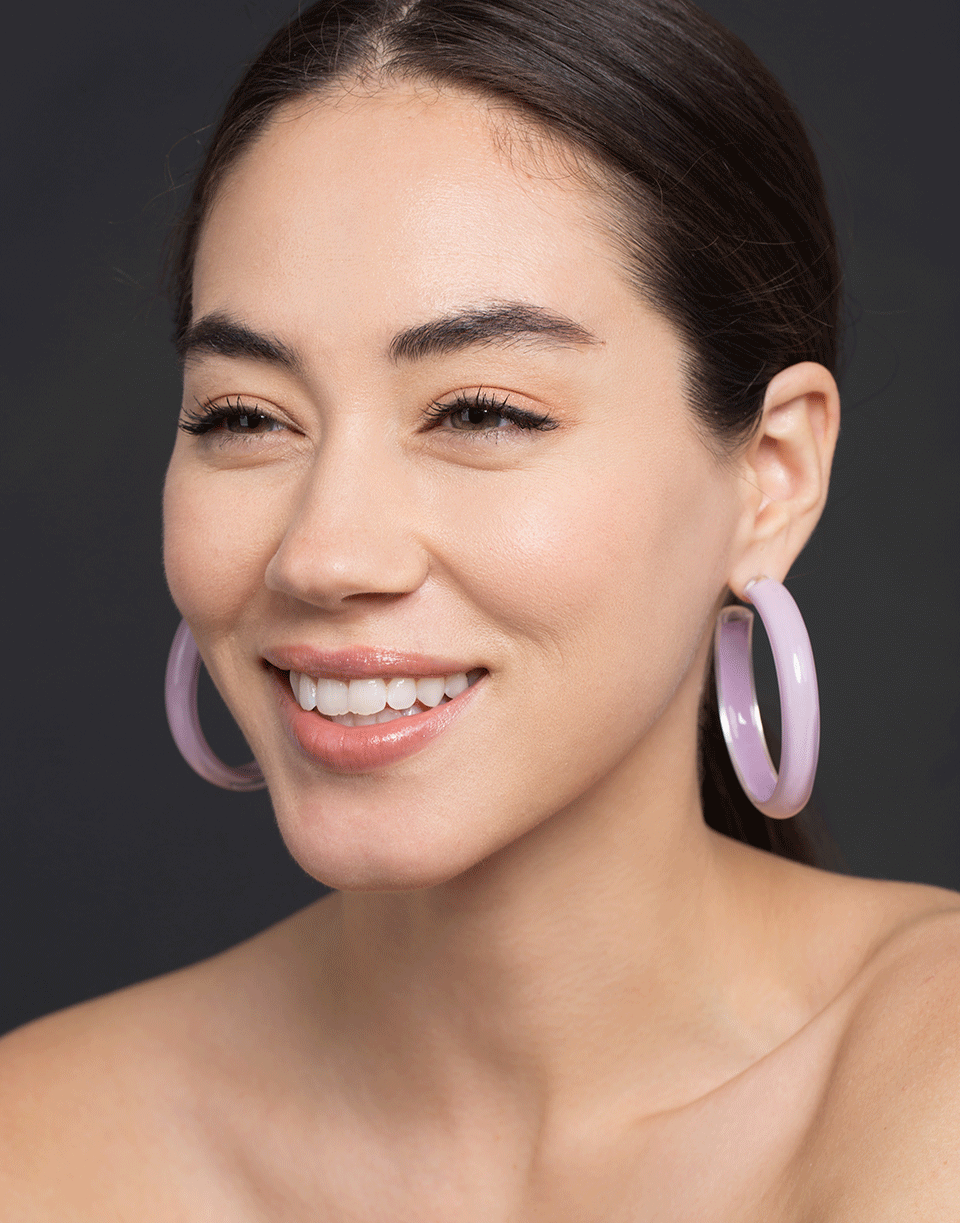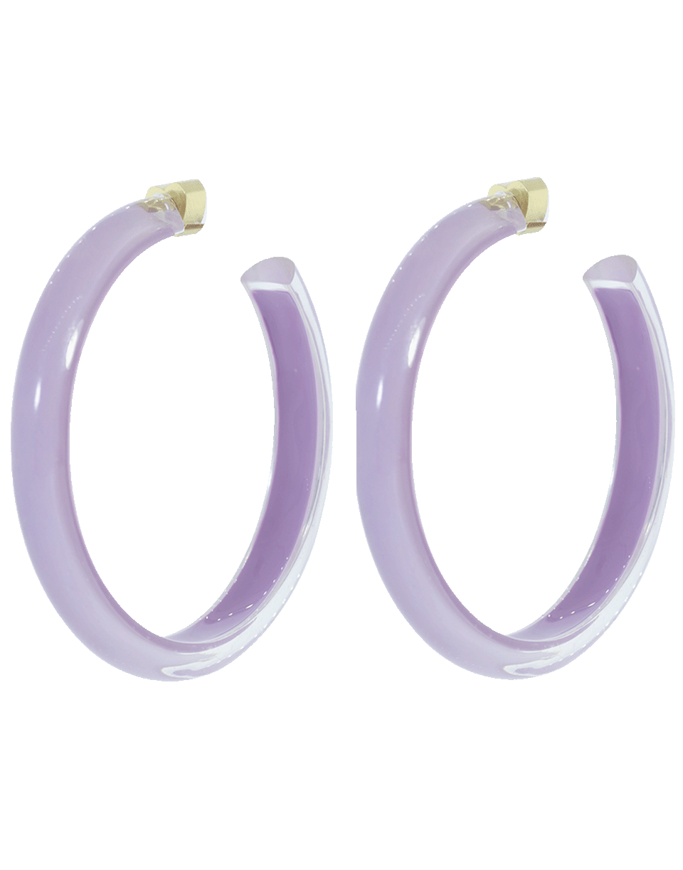 These medium Alison Lou 'Loucite' hoops are hand-painted with lavender enamel, covered in clear Lucite, and finished with brass plated 14k yellow gold backs and heart shaped posts.