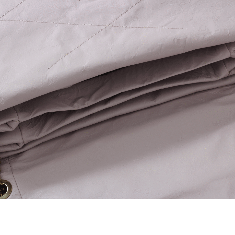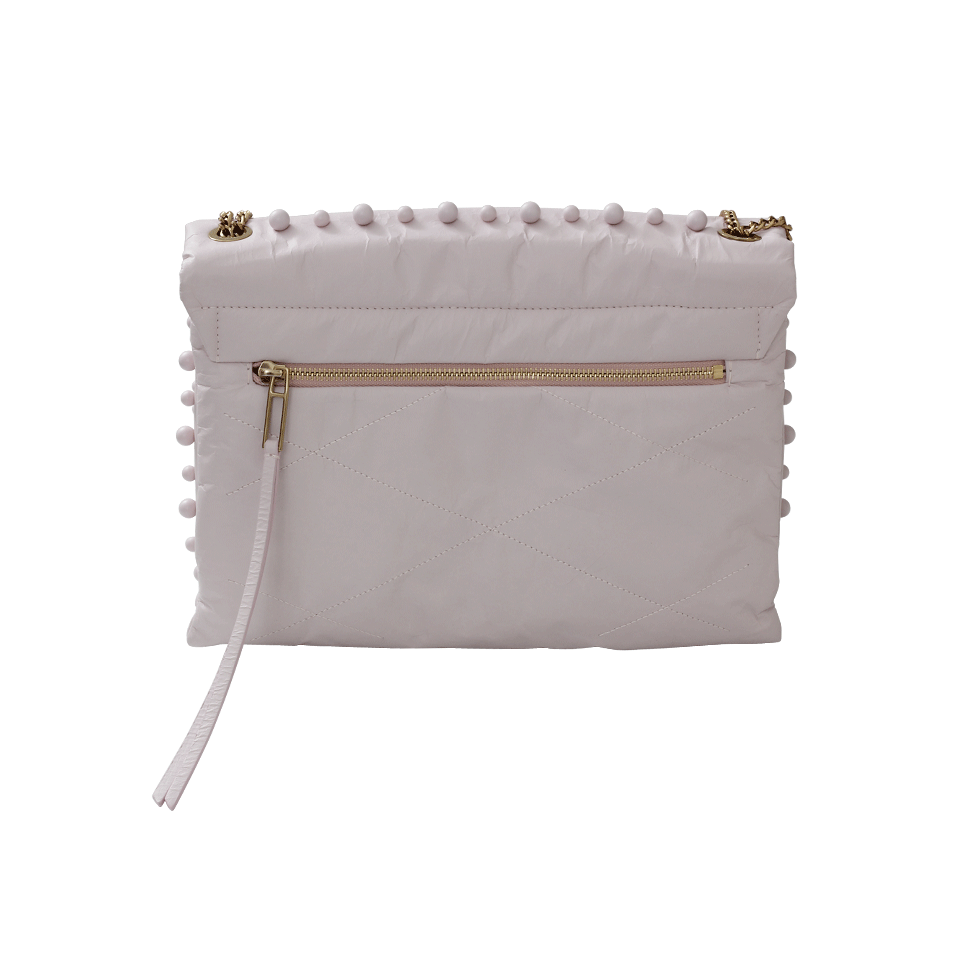 Magentic Snap Front Flap Closure With Gold Hardware And Crinkled Quilted Leather With Ball Embellishment Outer