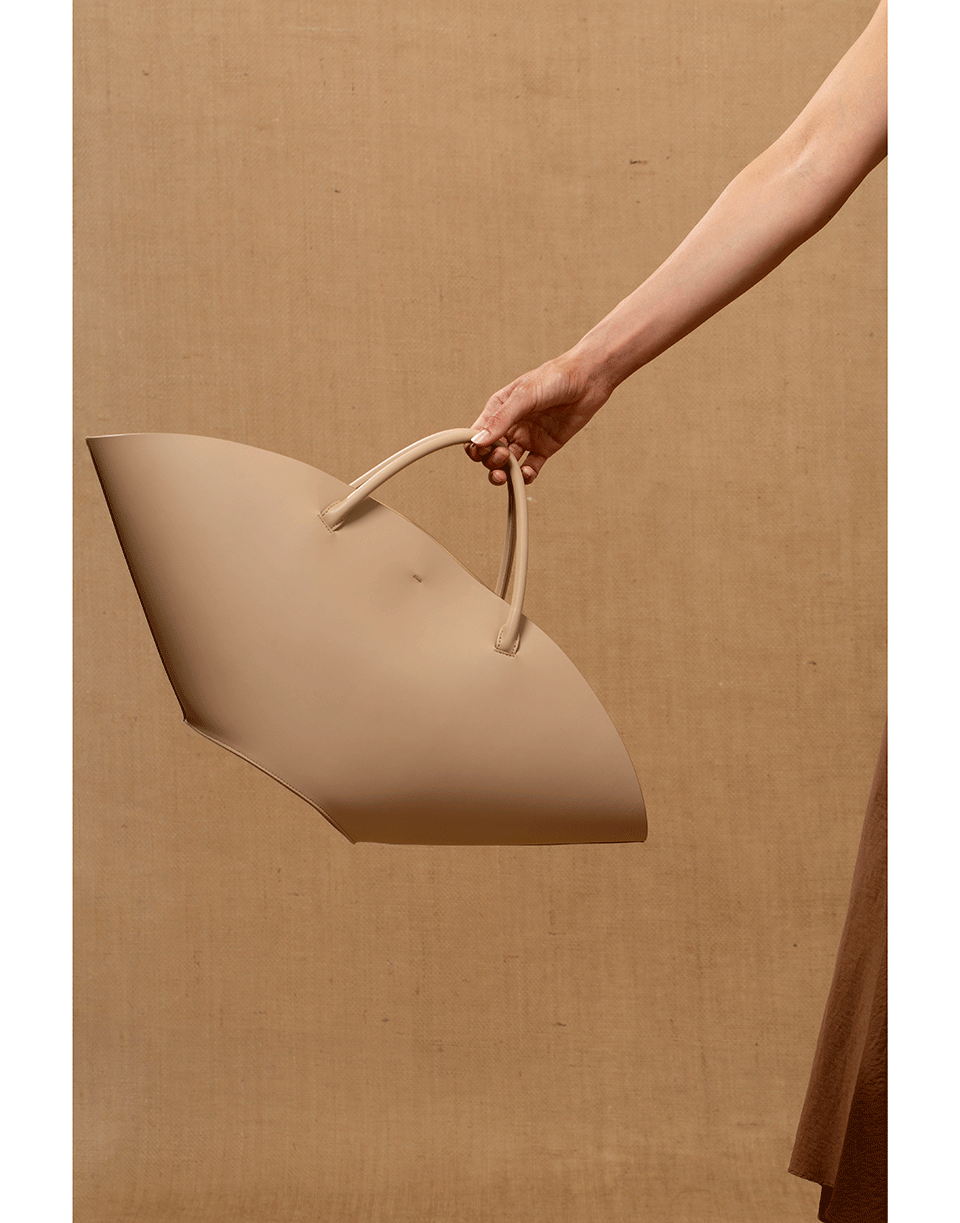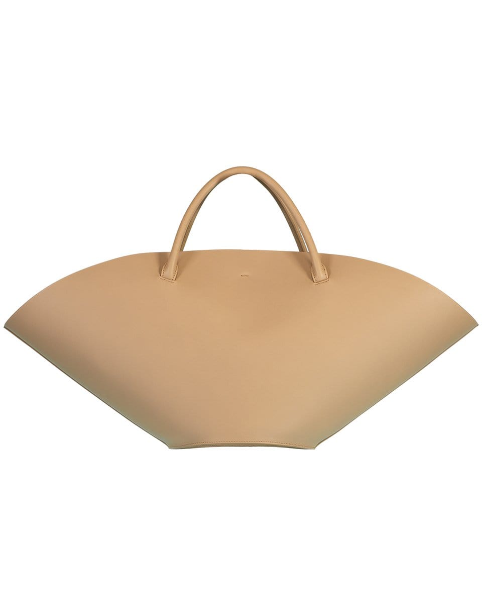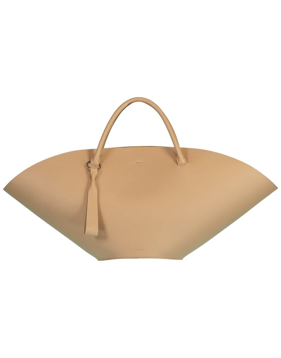 The Jil Sander sombrero shoulder bag was inspired by a woman walking to the beach carrying a sombrero hat under her arm. It features a dramatic tapered silhouette with top handles, detachable drawstring bag, hook fastening, and double shoulder strap.