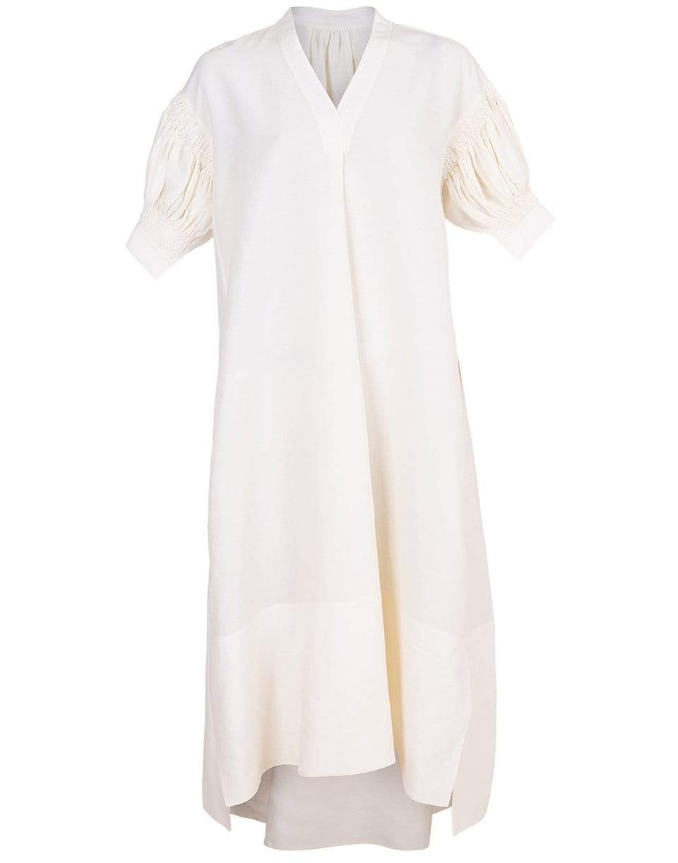 Jil Sander Mela Dress with pleated elbow sleeves, V-neck, loose fit, side pockets, split hem, and a mid-length.