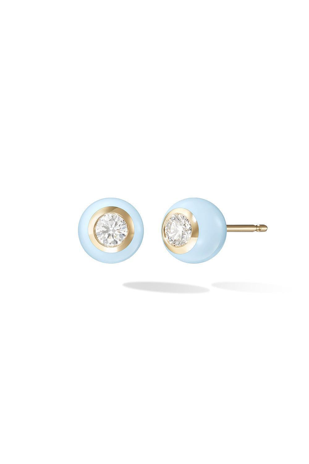 Melissa Kaye medium pastel blue audrey diamond stud earrings in yellow gold.