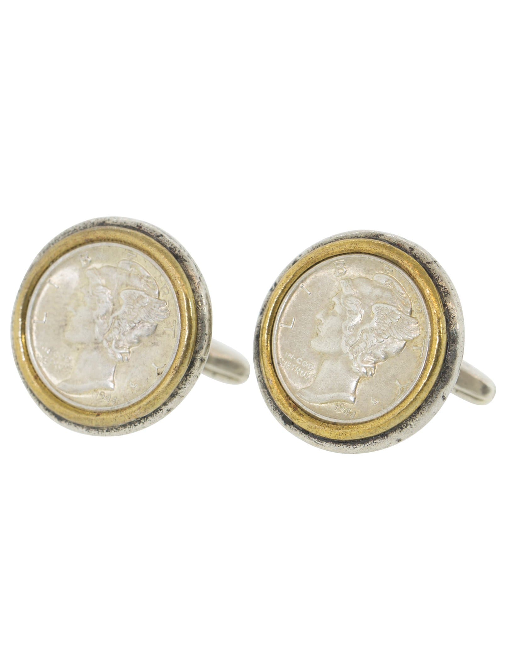 John Varvatos mercury dime coin cufflinks with distressed sterling silver and a brass frame.