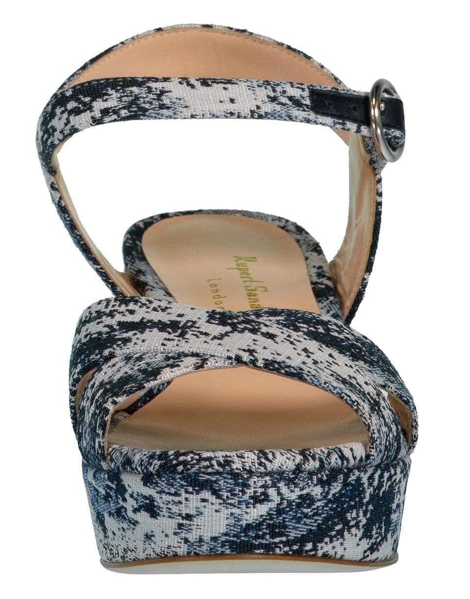 Rupert Sanderson metallic Deidre platform sandal with an open toe, crossover straps. buckle closure, and leather soles.