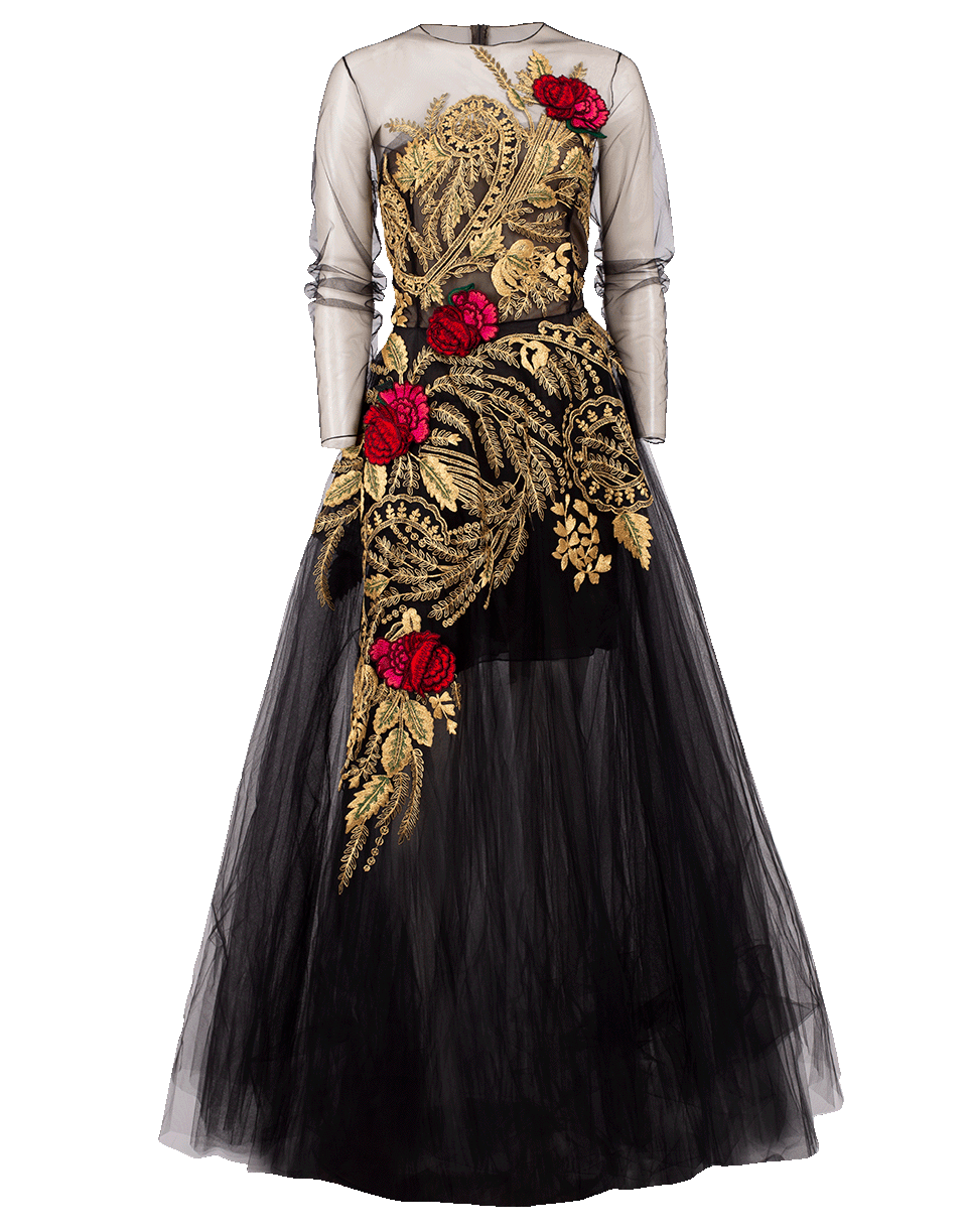 This tulle gown from Oscar de la Renta features mesh long sleeves, a round neckline, a fitted bodice and full skirt with metallic floral embroidery and a concealed zip closure at back.