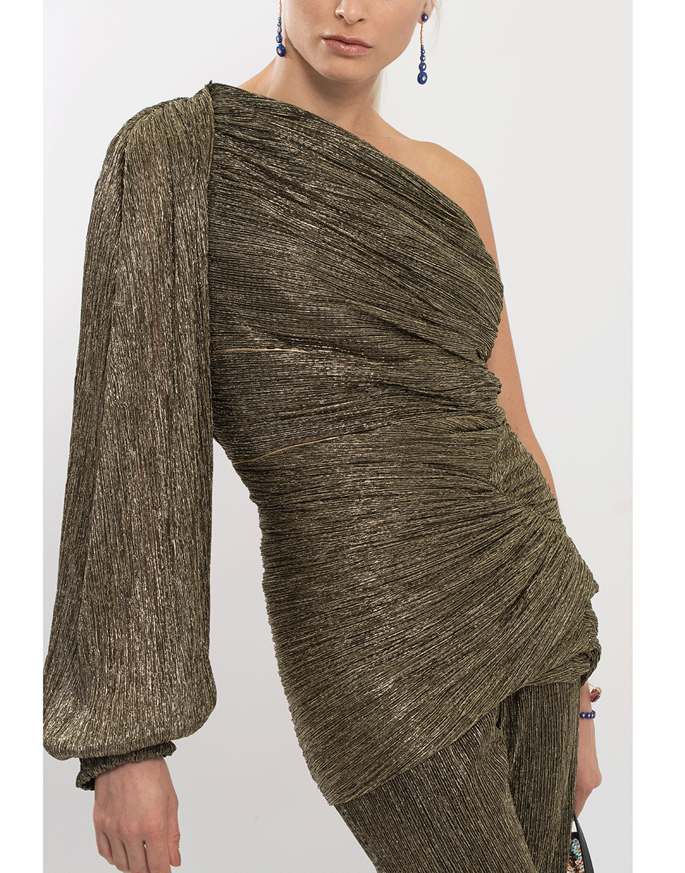 Metallic jersey one shoulder mini dress from Peter Pilotto featuring a slim fit, one shoulder silhouette with a draped long sleeve, and a concealed zip closure.