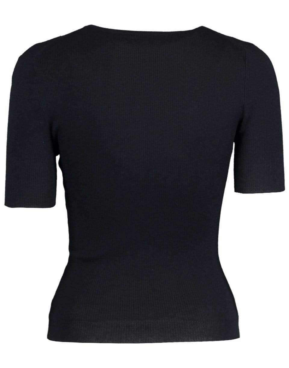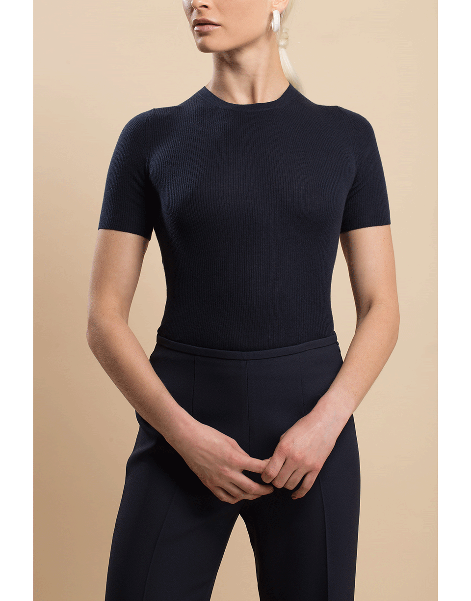 Michael Kors slim fit crewneck knit top with short sleeves, ribbed design, and a pull over style.