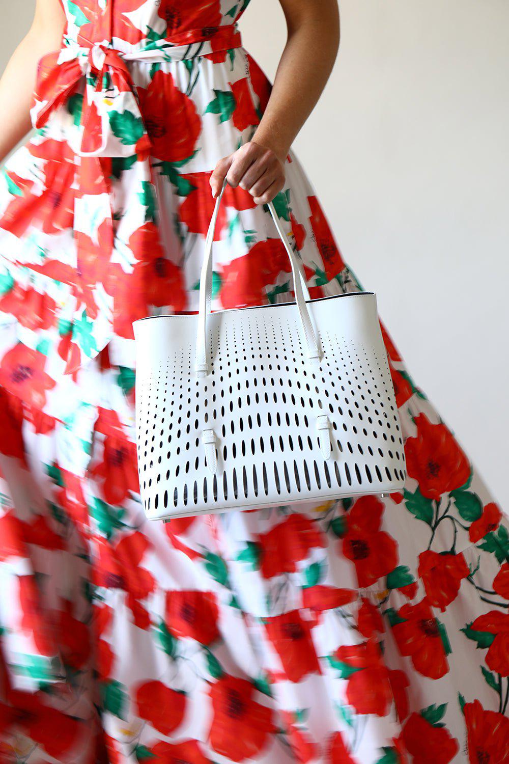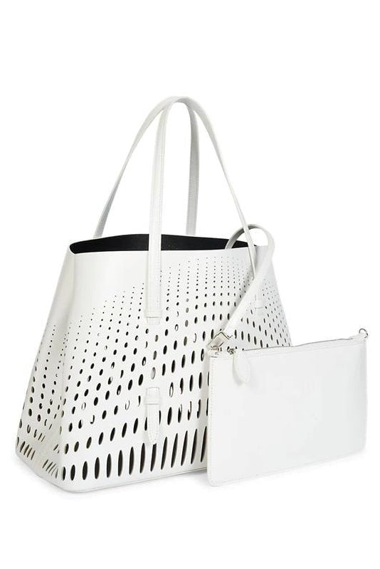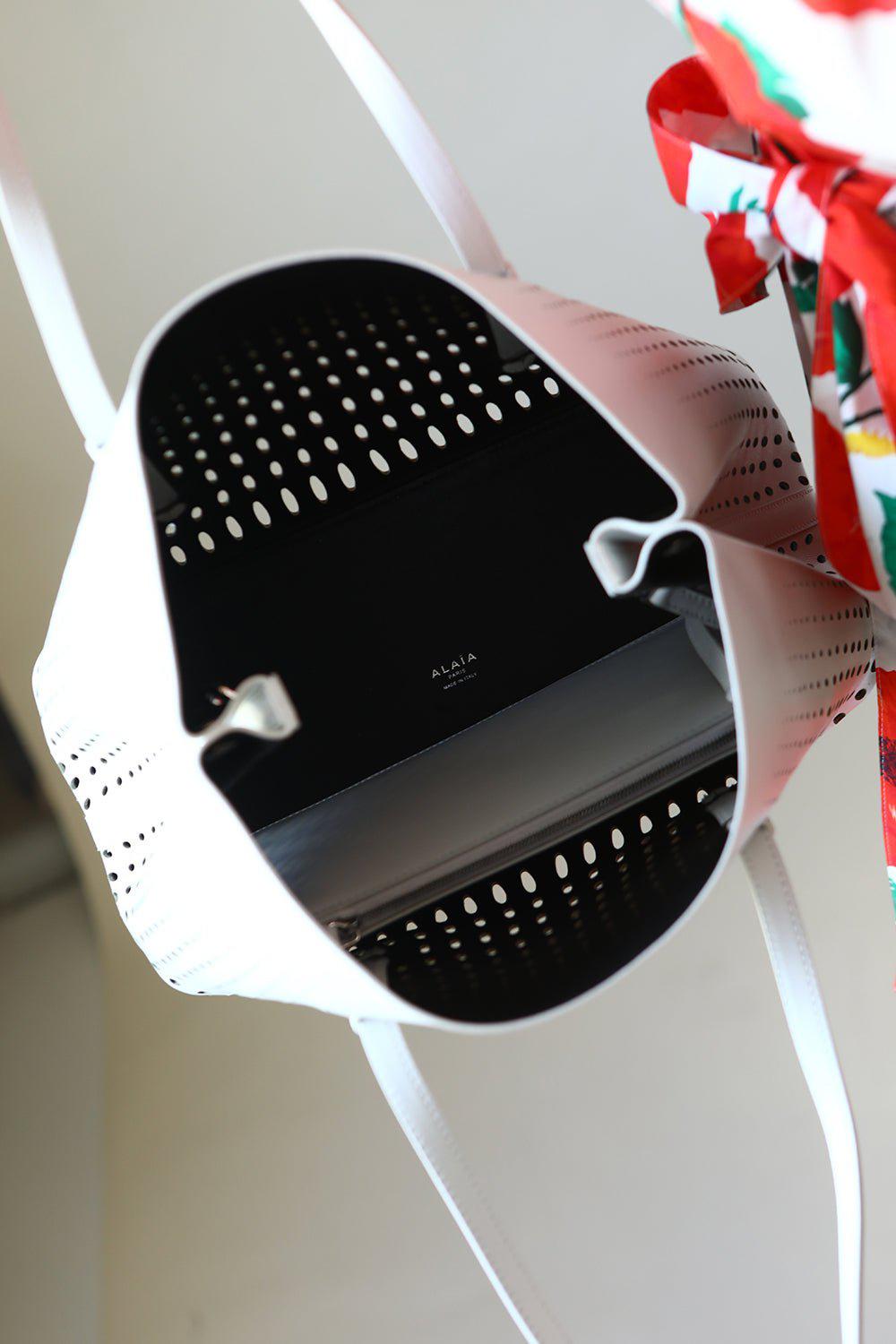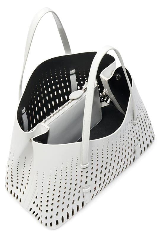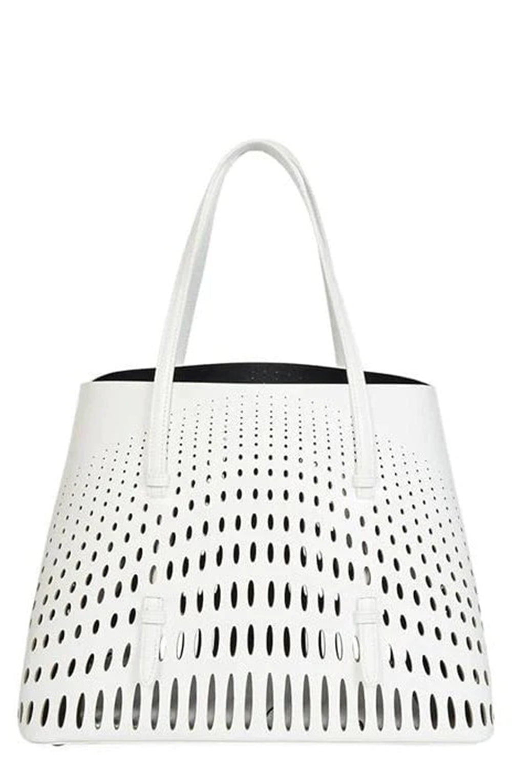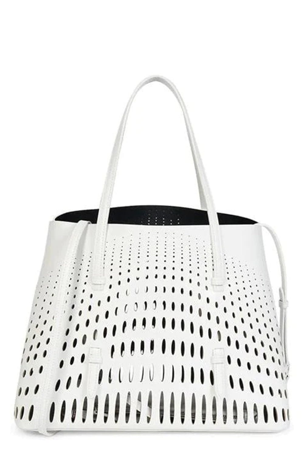 Medium tote bag, graphic perforation, snap-fastening gusseted sides that expand, galvanised silver hardware, detachable leather pouch, detachable strap, hand or shoulder carry.
