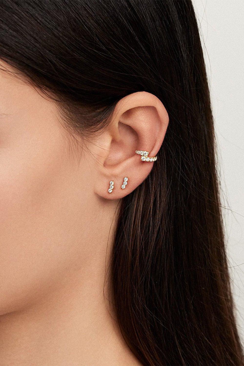 Melissa Kaye mini aria diamond triple stud earrings in yellow gold.