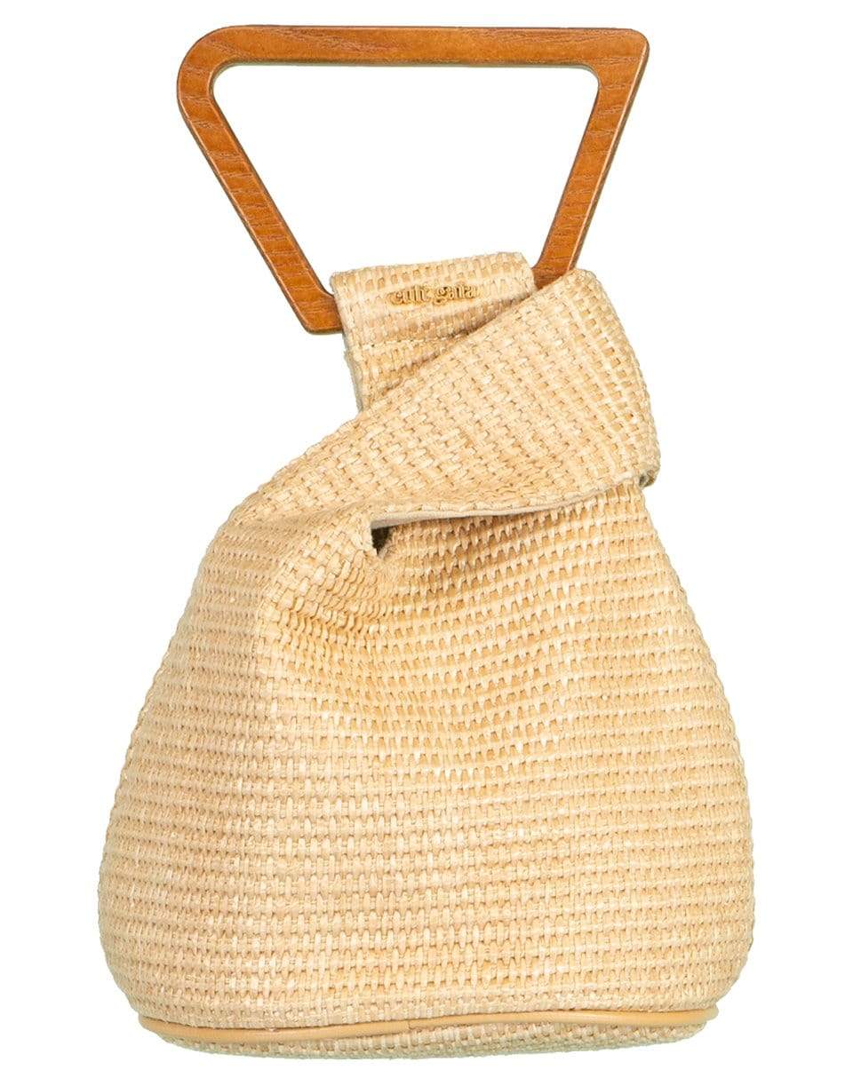 The Astraea mini bag from Cult Gaia features a geometric wooden top handle and an open top.
