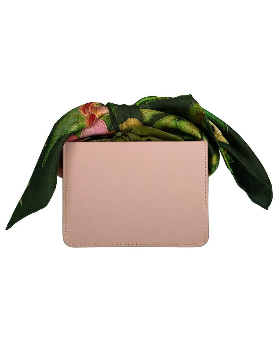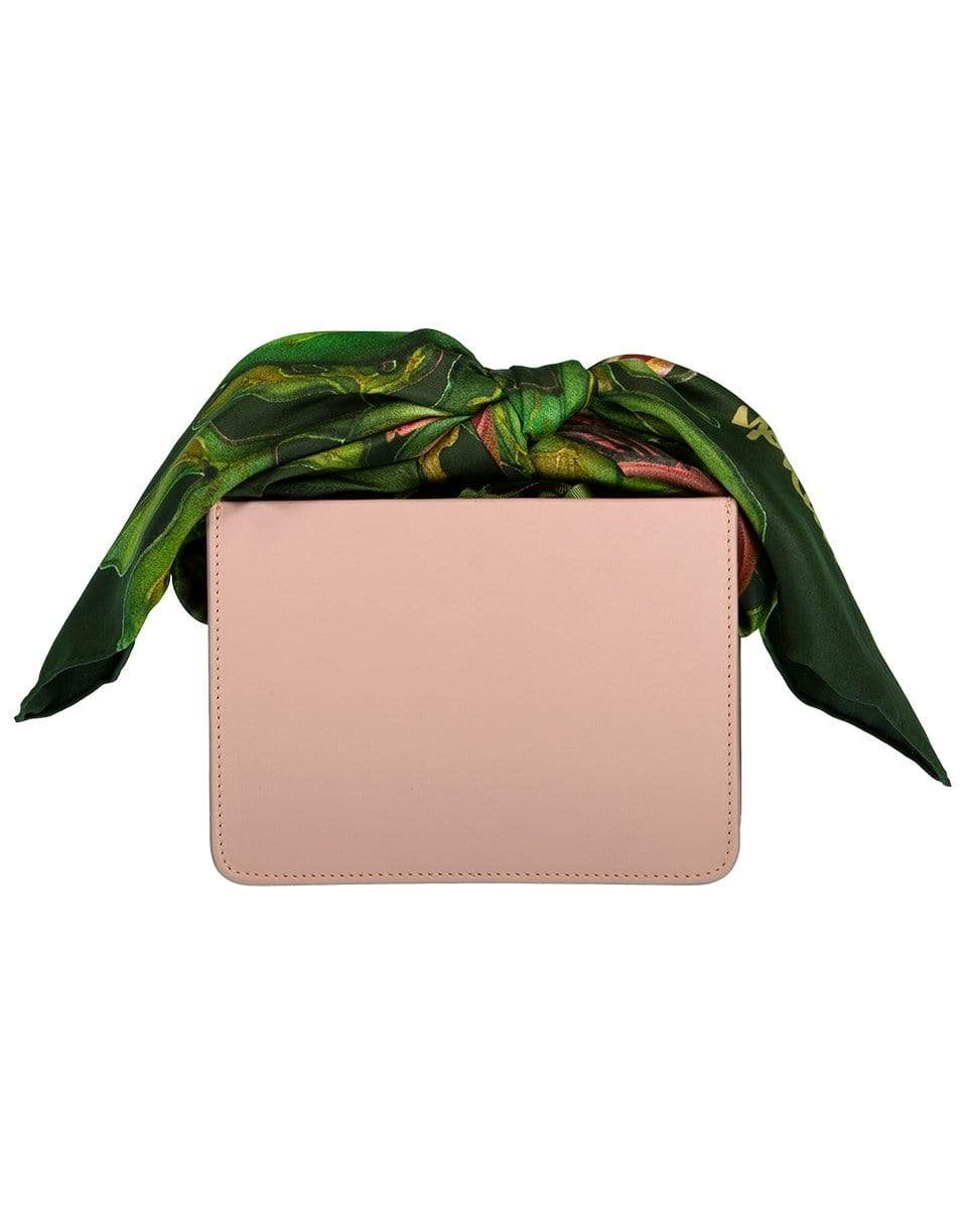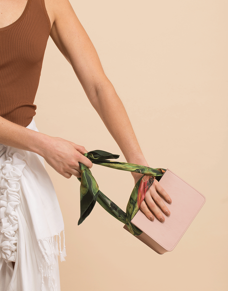 The Guaria bag from Montunas features a structured rectangle silhouette crafted from vegetable tanned leather with a removable internal drawstring pouch and a silk scarf handle.