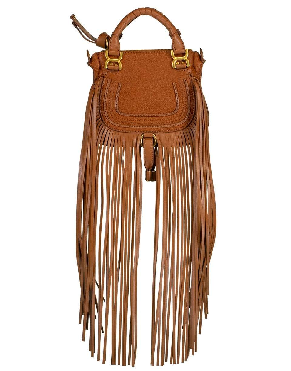 Chloe mini Marcie fringe leather bag with double handles, zip top, flap accent with tassle closures, gold-tone hardware, slip pocket, removable strap, and a cascading fringe detail.