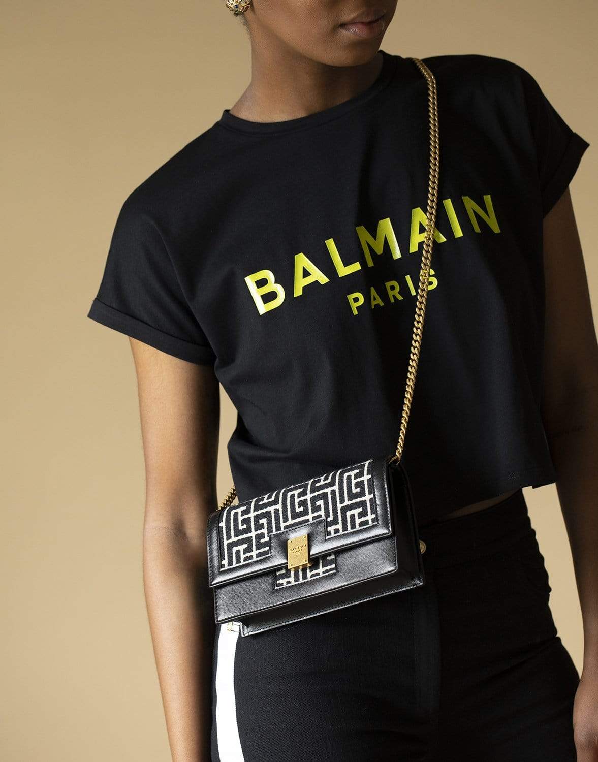 This black Balmain 1945 monogram jacquard shoulder bag has been made in Italy. It has leather trims, a fold over front, a burnished and branded gold tone magnetic fastening, a chain shoulder strap and an all-over jacquard pattern. This Balmain bag is inspired by Renaissance labyrinth gardens in France, which symbolise the journey of life. With that in mind, we’d be a-maze-d if you didn’t pick this bag.