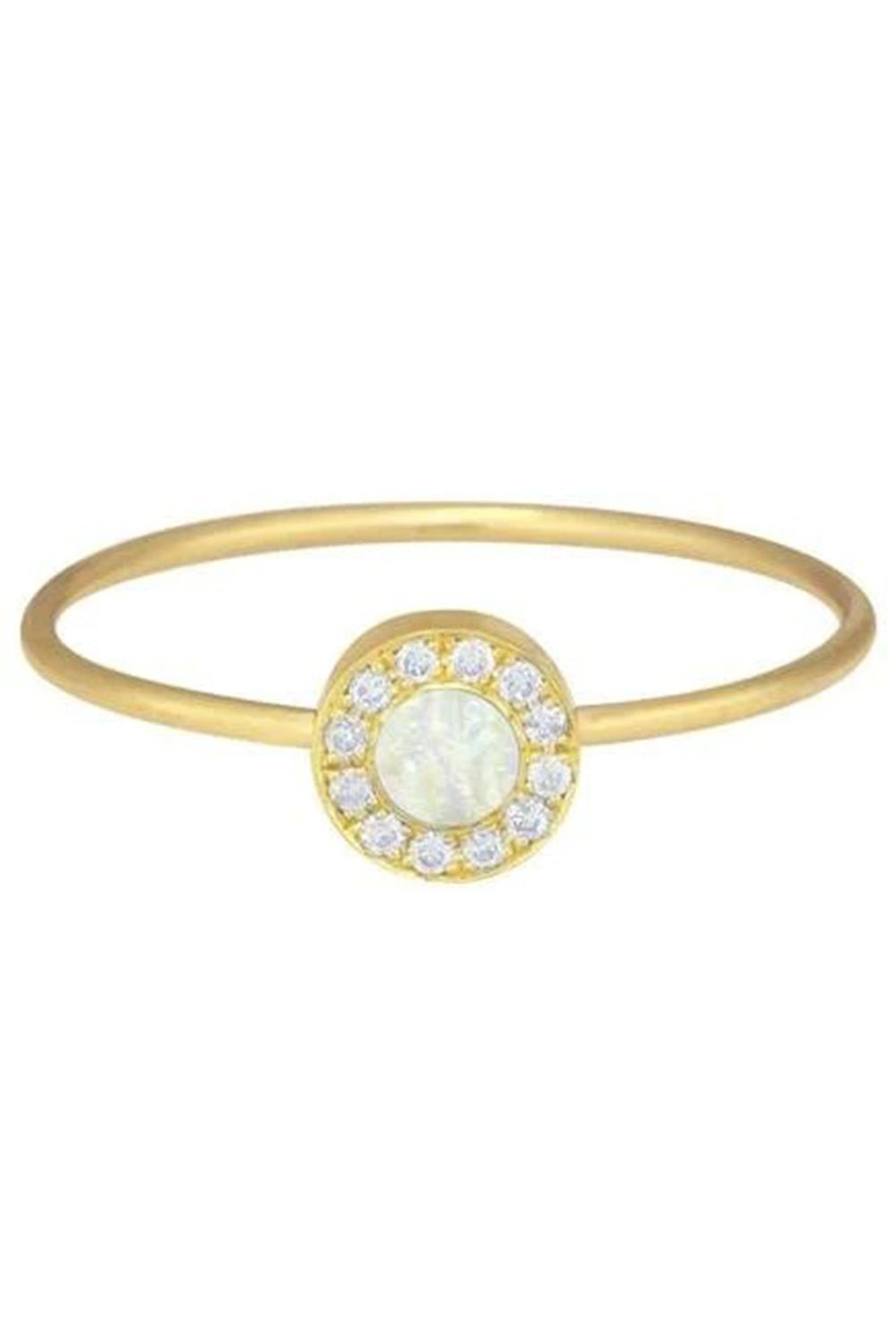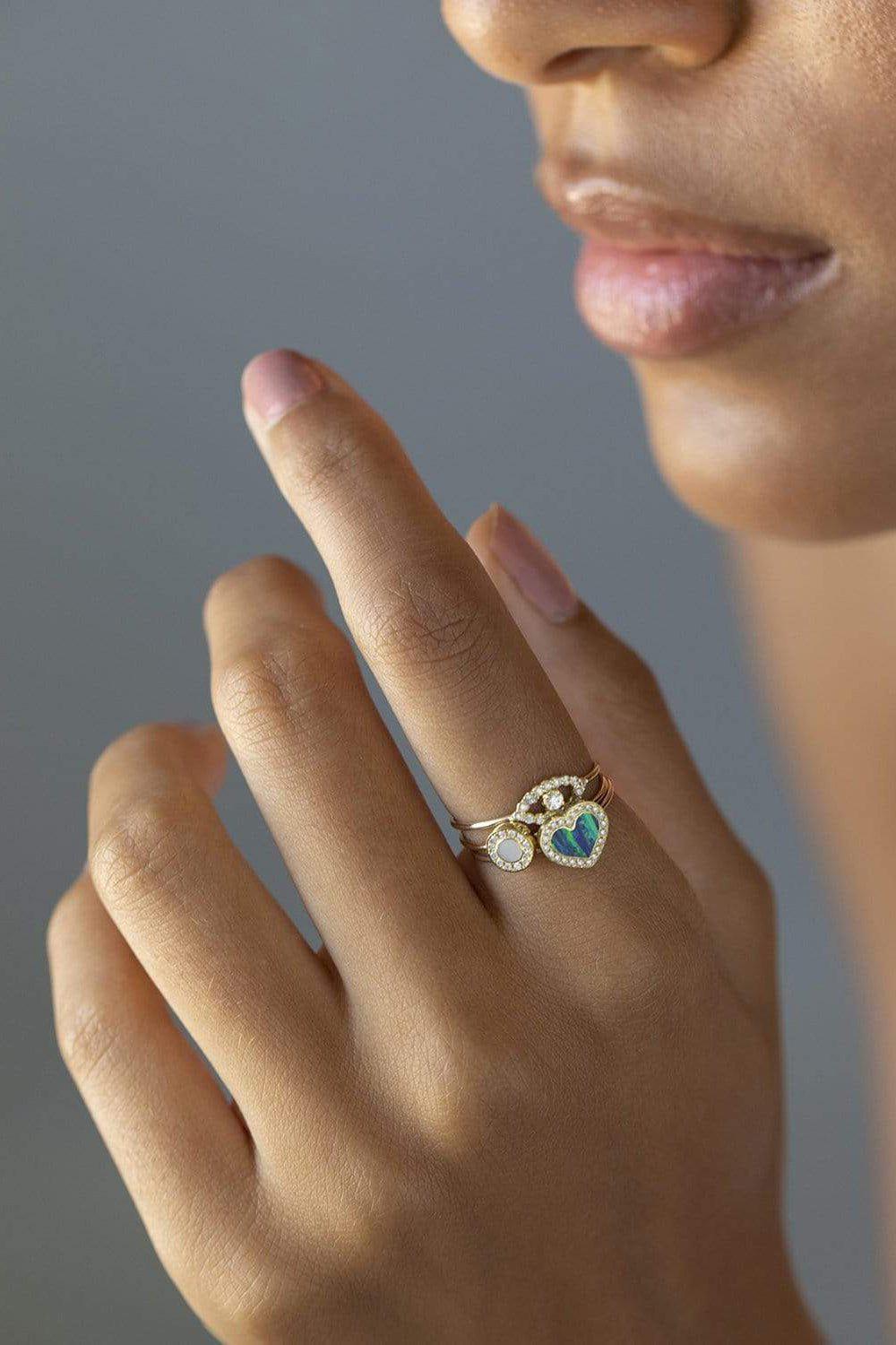 Jennifer Meyer mother of pearl and diamond mini circle ring. Handcrafted in 18-karat yellow gold, this Jennifer Meyer statement making heart ring is set with mother of pearl inlay and framed by shimmering pavé diamonds. A symbol of love, wear the forever piece to elevate your everyday, signature look.