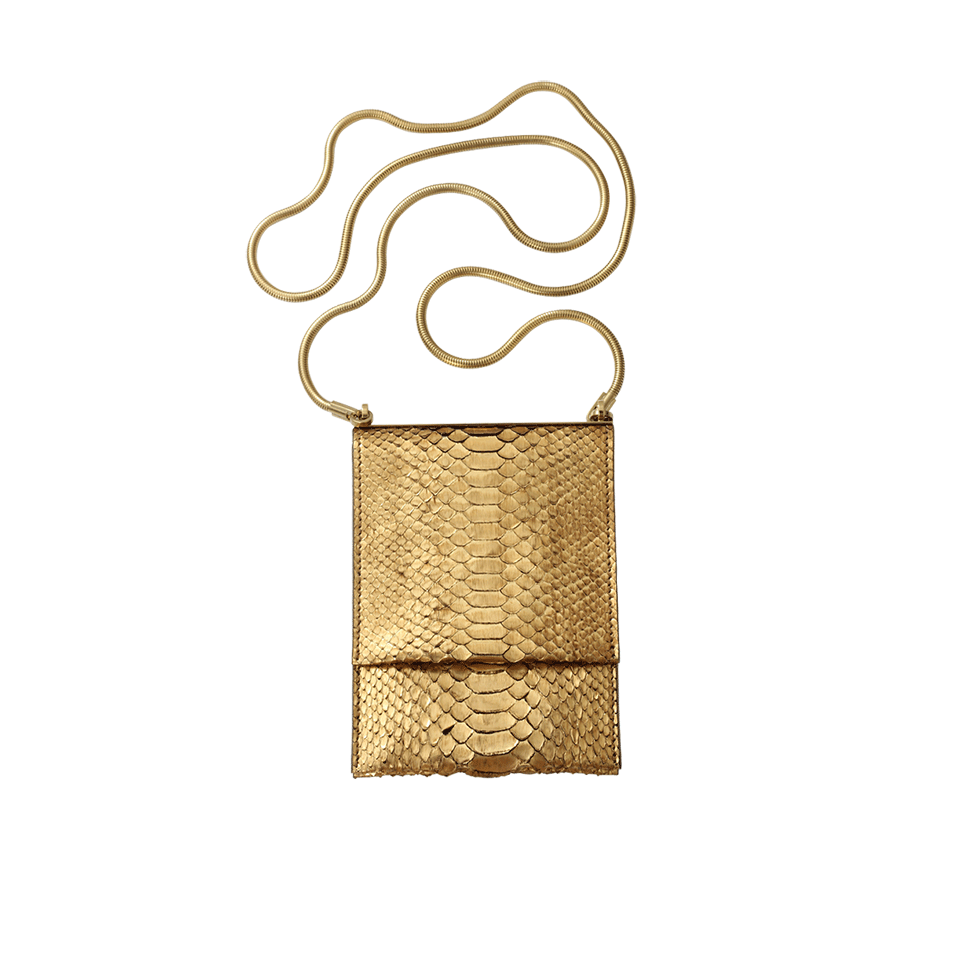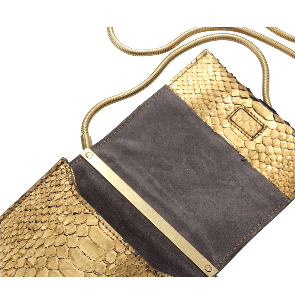 Magnetic Snap Front Flap Closure With Gold Hardware And All-Over Metallic Python Design