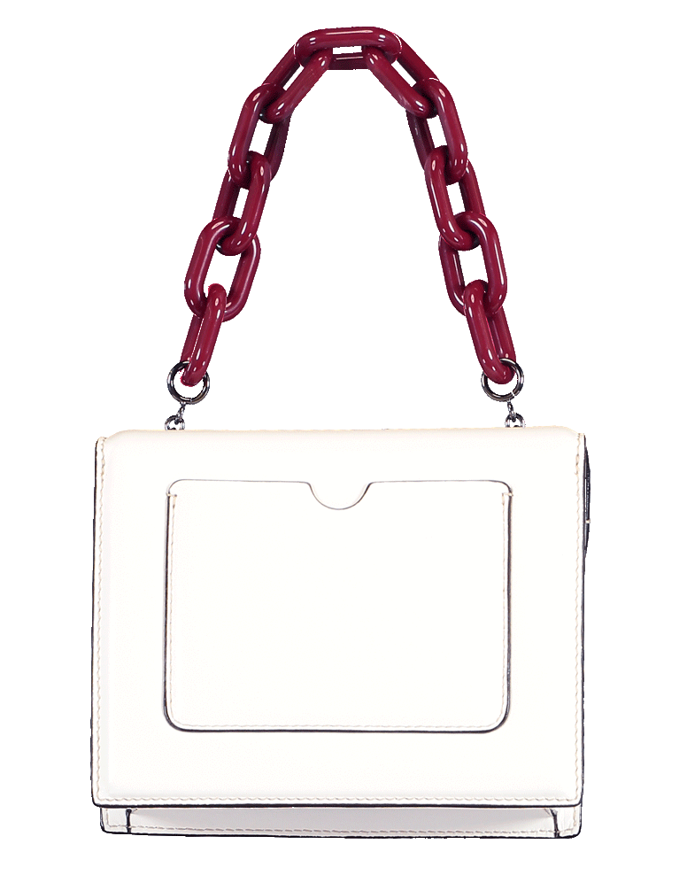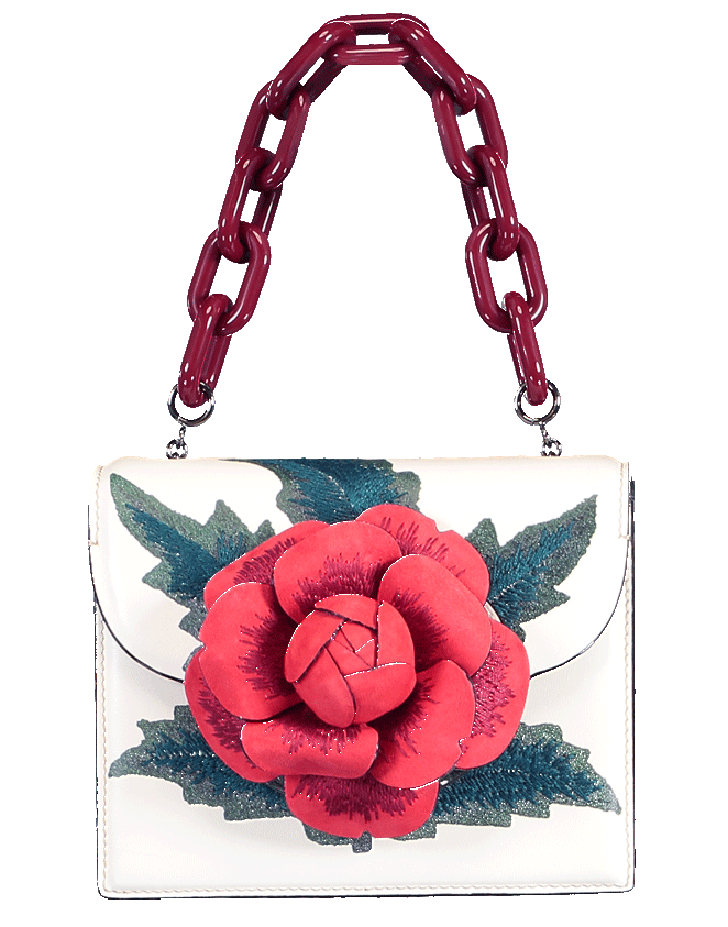 The TRO bag from Oscar de la Renta is cut from calfskin leather and features a red gardenia at the magnetic front flap, an interior pocket, and finished with a removable red acrylic chain strap.