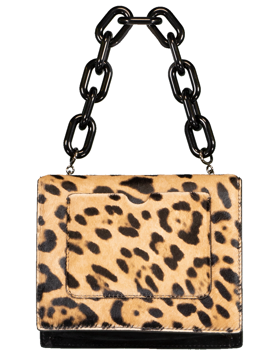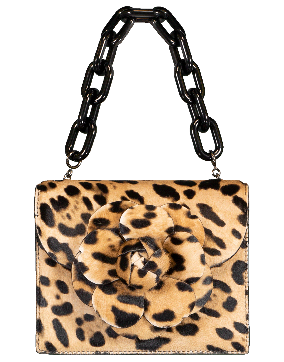 This mini calf hair TRO bag from Oscar de la Renta features a matching leopard print gardenia at the magnetic front flap, an interior pocket, and finished with a removable black acrylic chain strap.