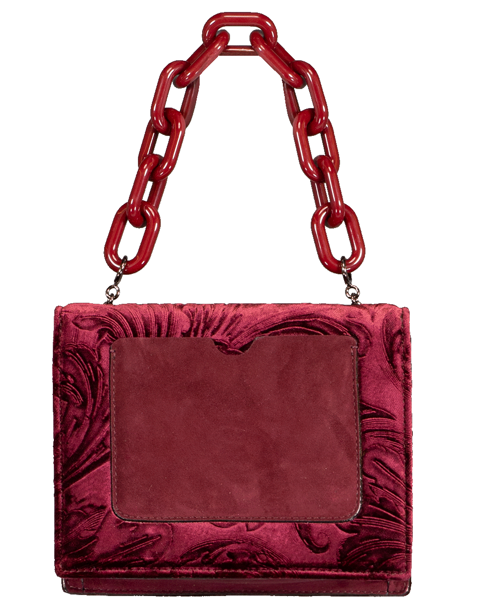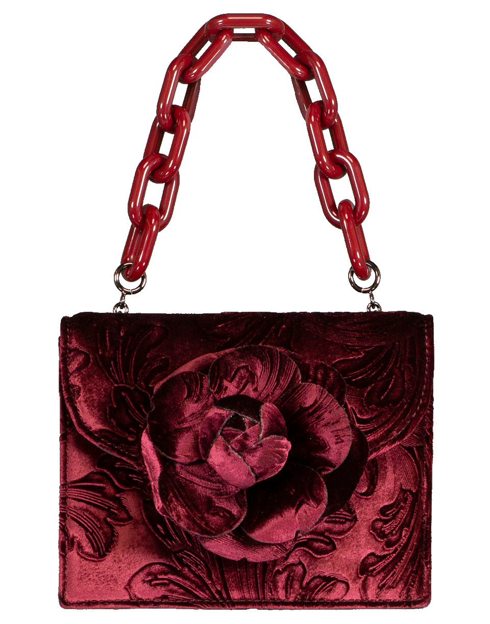 This mini TRO velvet bag from Oscar de la Renta features a matching red gardenia at the magnetic front flap, an interior pocket, and finished with a removable red acrylic chain handle.