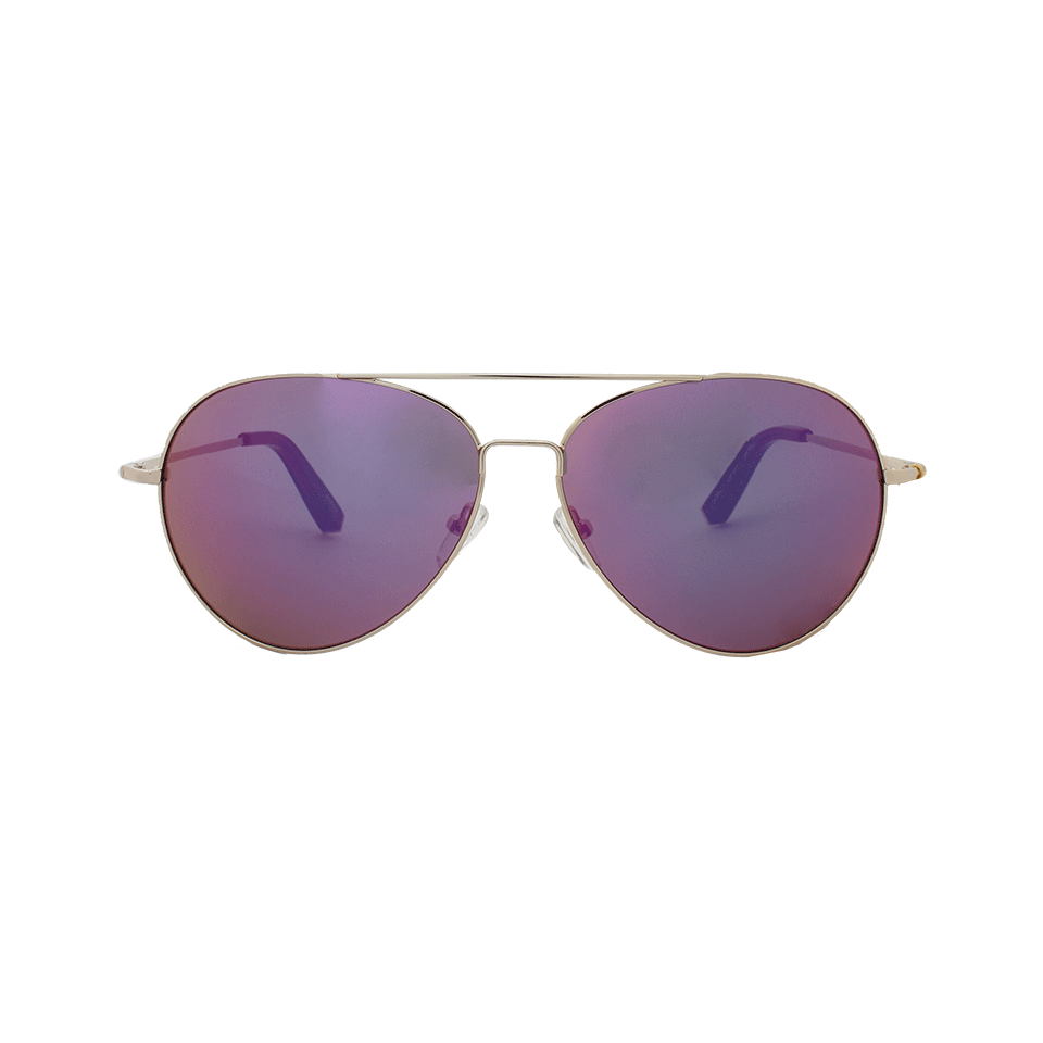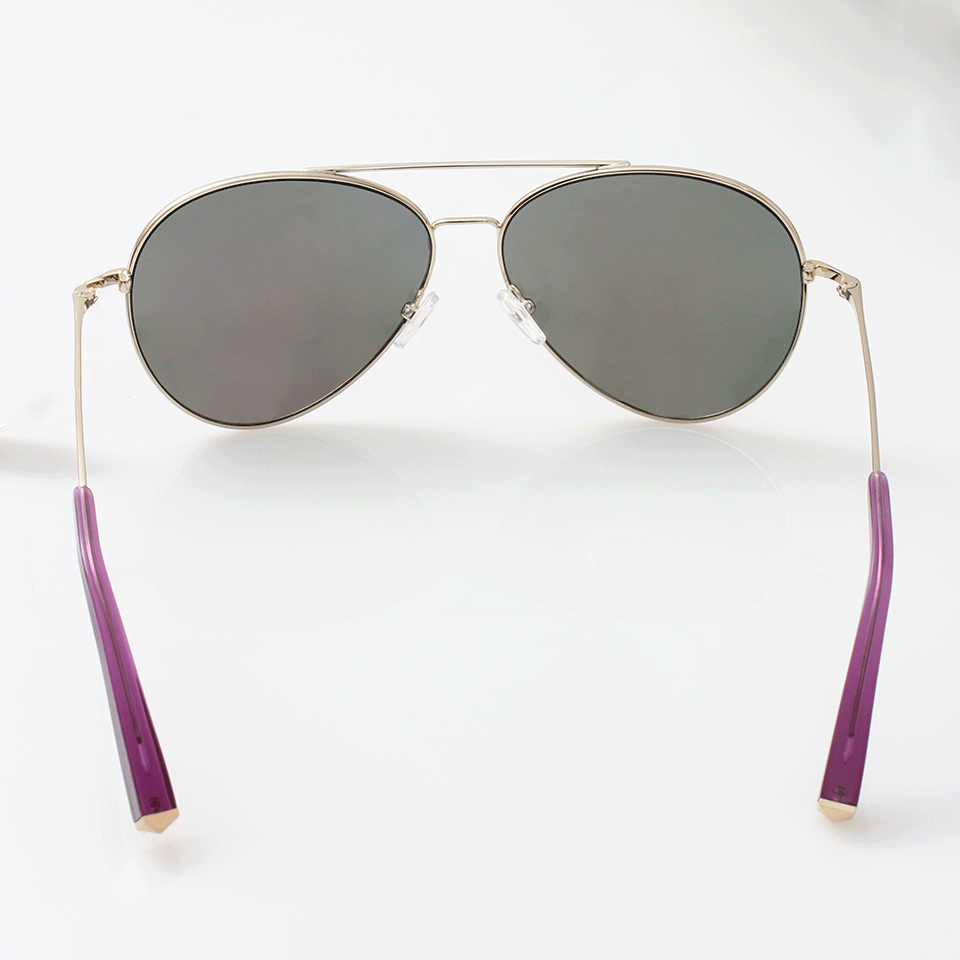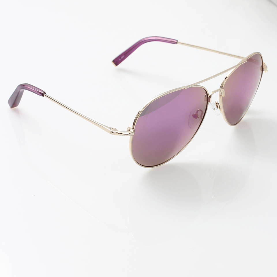 Gold Metal Frames With Purple Mirrored Lenses And Purple Acetate Arm Endings With Gold Triangle Stud Details