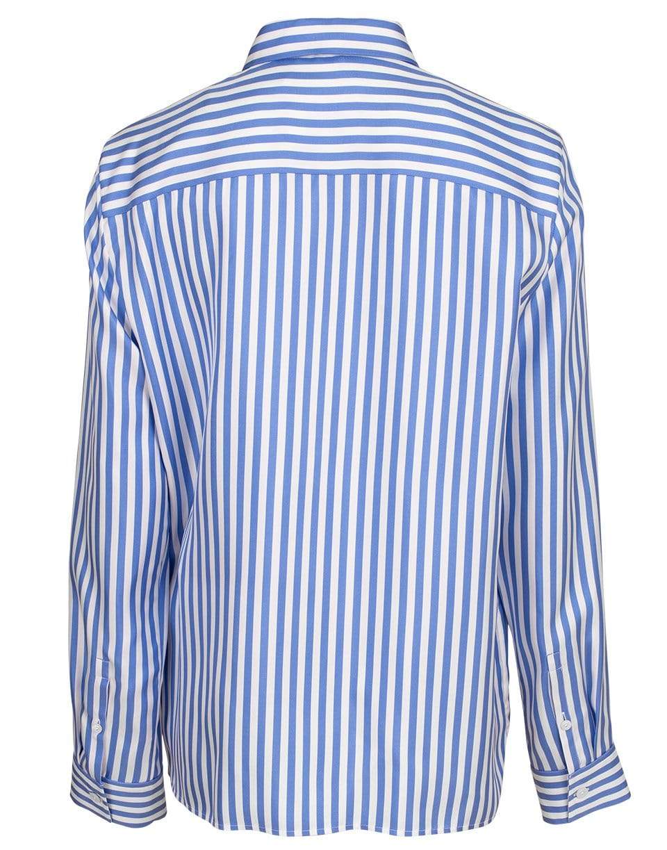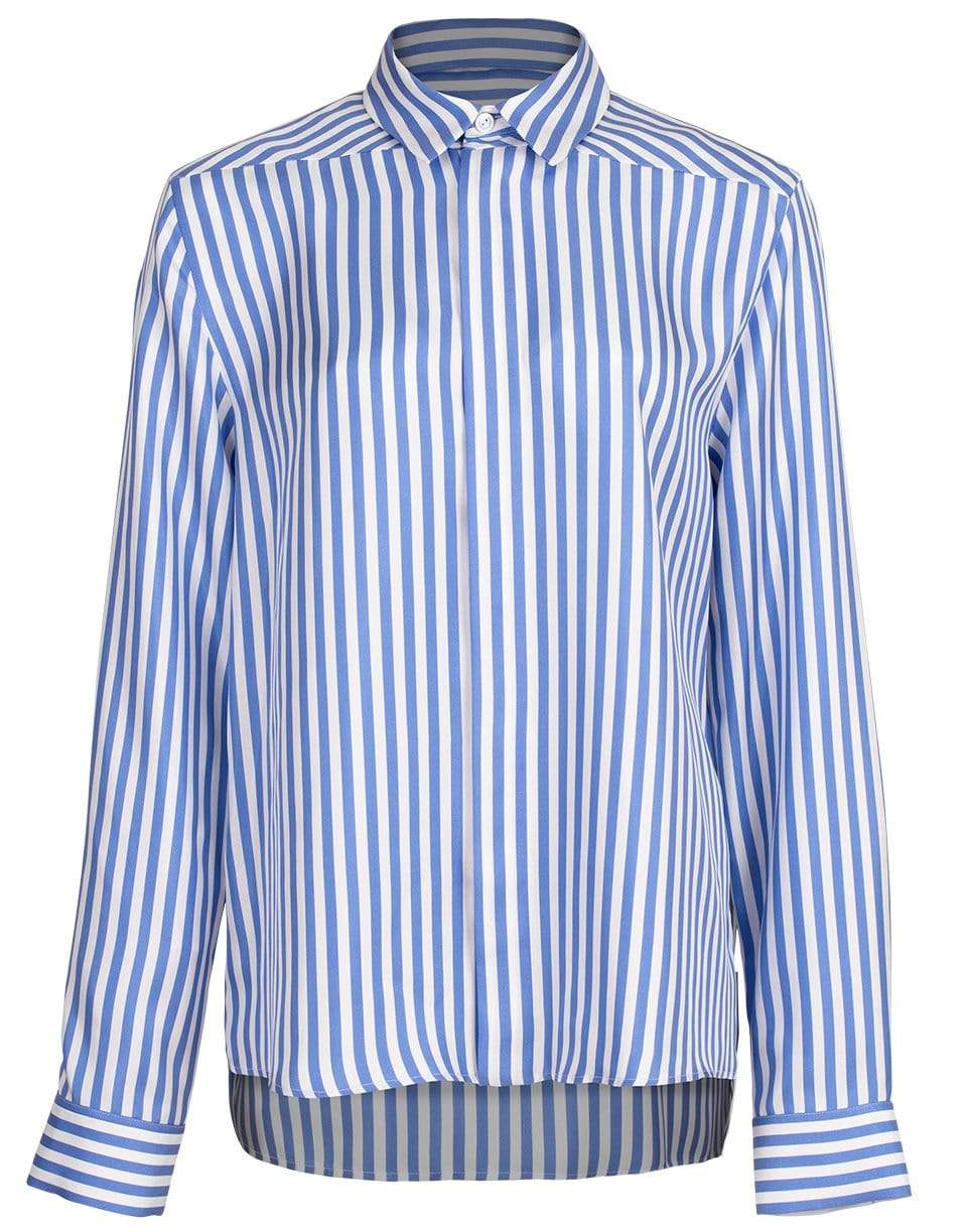 Jil Sander blue and white striped Moia shirt with a regular fit, classic collar, concealed button placket, and a long sleeves.
