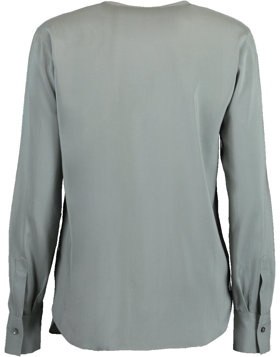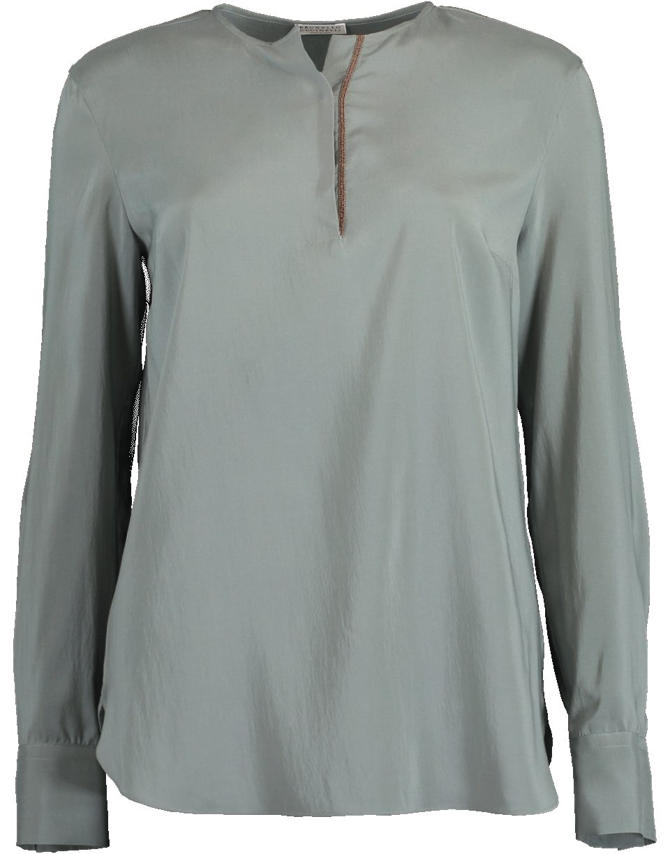 This lightweight stretch silk crepe de chine top from Brunello Cucinelli features a henley design with a v-neckline, long sleeves, a loose relaxed fit, snap button closure and a monili stripe at front.