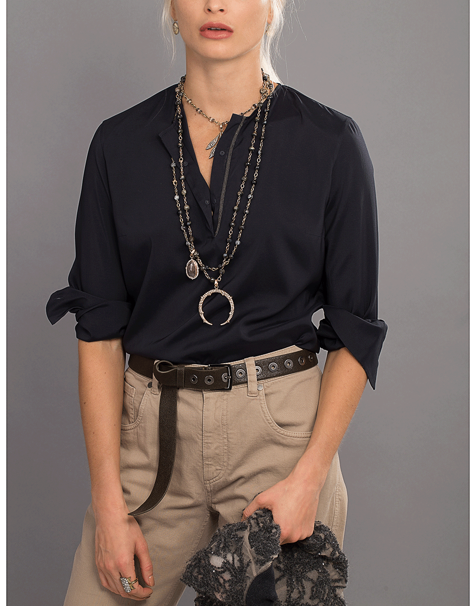 This lightweight stretch silk crepe de chine top from Brunello Cucinelli features a henley design with a v-neckline, long sleeves, a loose relaxed fit, snap button closure and a monili stripe at front.