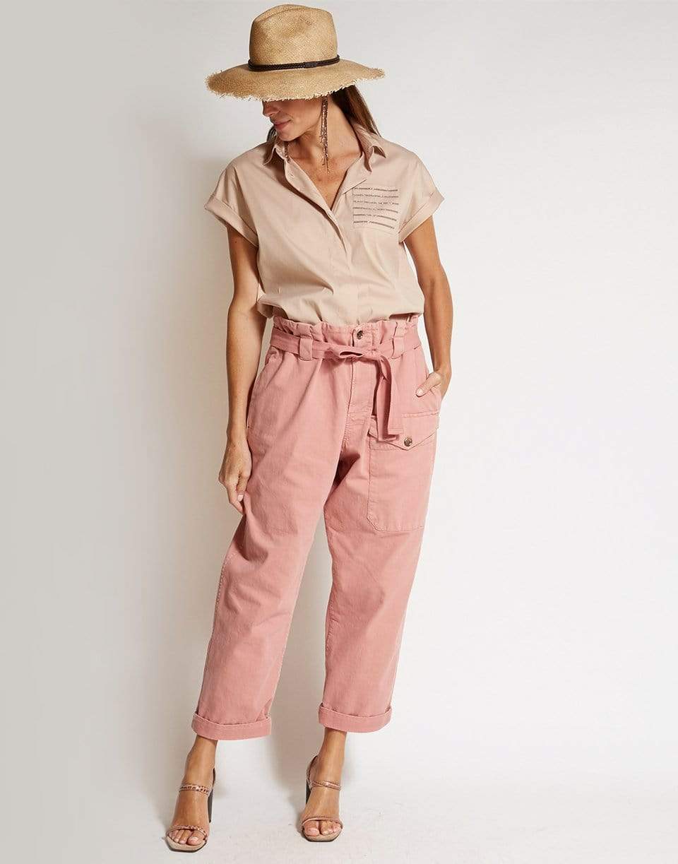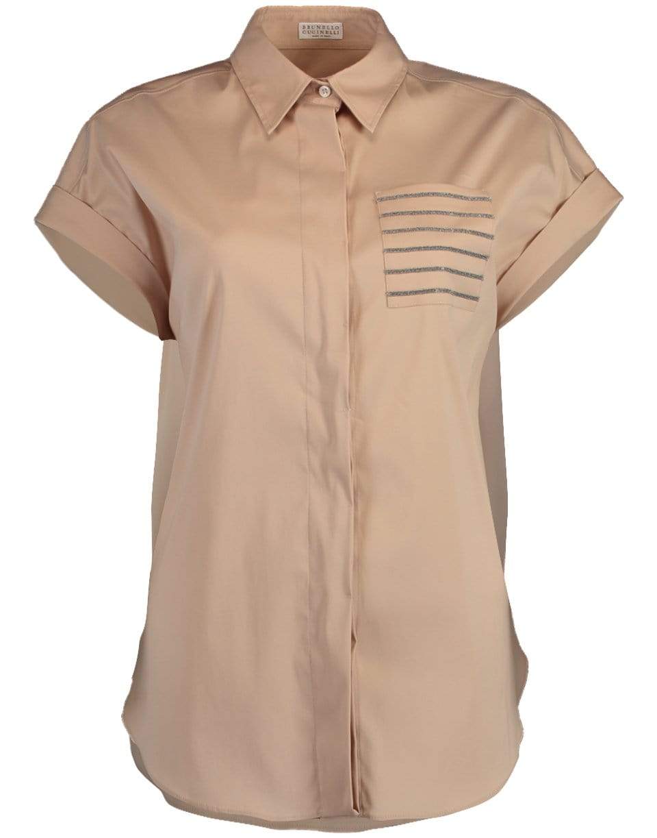 Brunello Cucinelli stretch cotton cap sleeve button up shirt with monili striped pocket detail, conceaeled button placket, spread collar, and a regular fit.