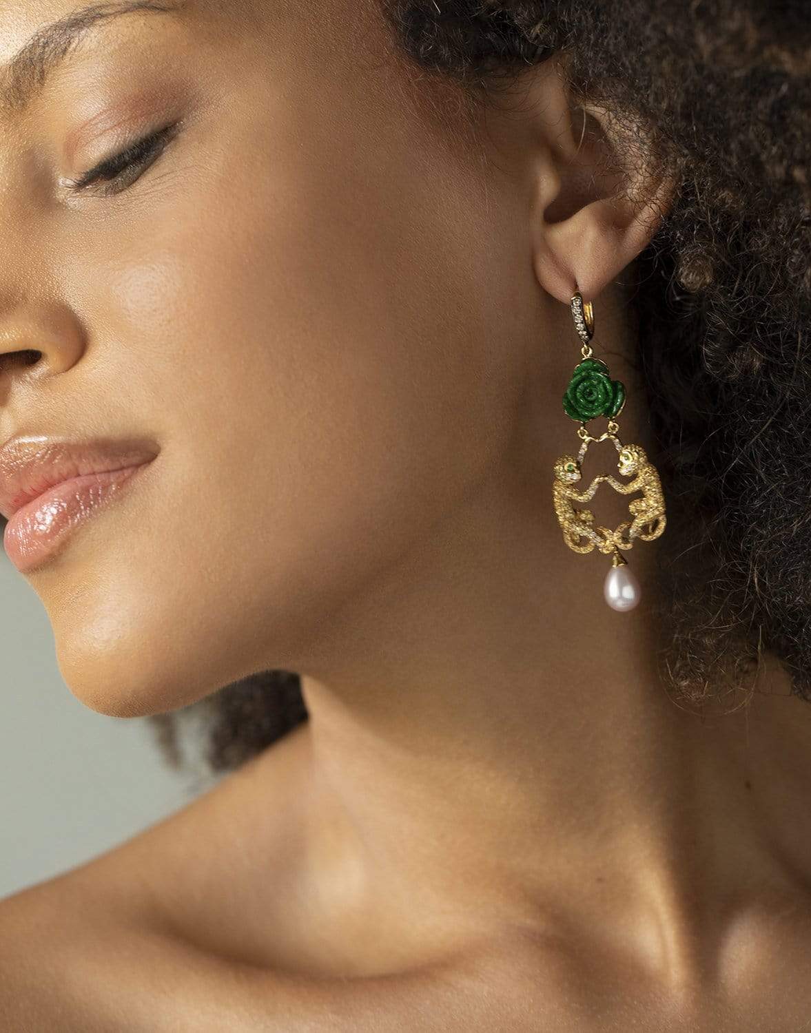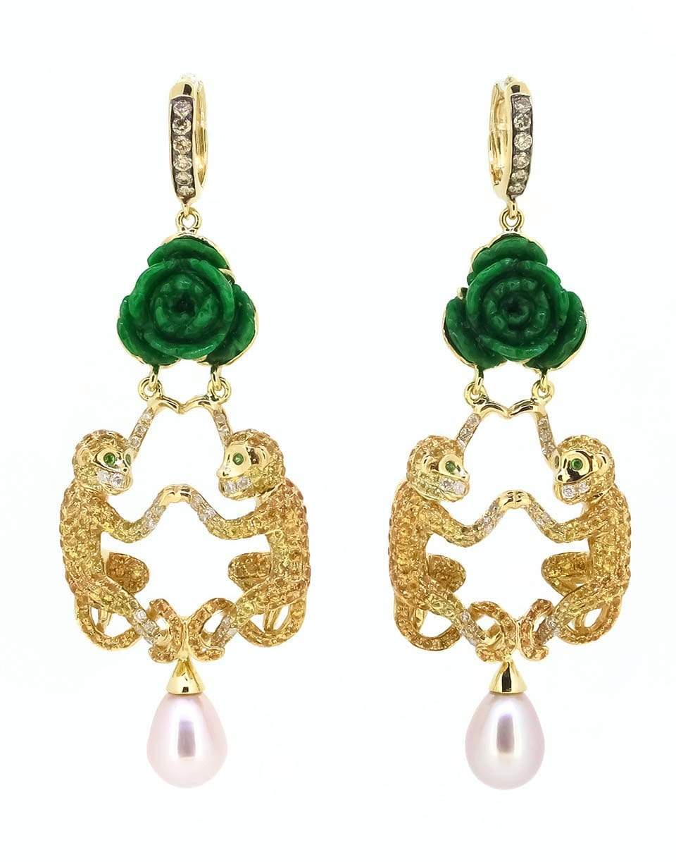 Wendy Yue Monkey Earrings. Two diamond, sapphire, and tsavorite accented monkies holding one hand to each other and the other from a carved Jade rose. These playful drop earrings give beautiful movement all the way from the huggie clasp to the pearl finish.