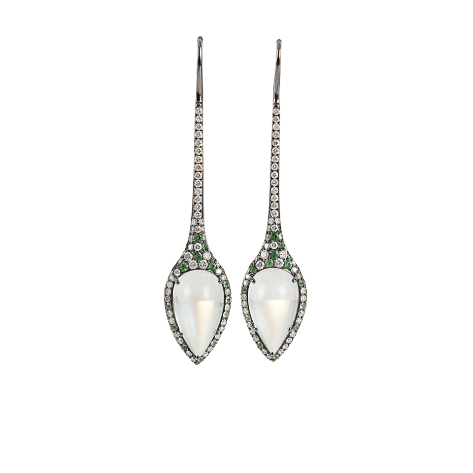 Almost looking like tear drops, Arunashi’s moonstone, demantoid, and diamond earrings may have you weeping with joy for these unique baubles.