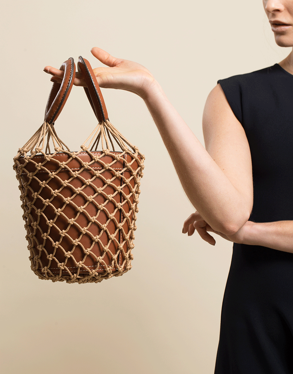 The Moreau from Staud features a beautiful calf leather bucket silhouette with netting and leather handles.