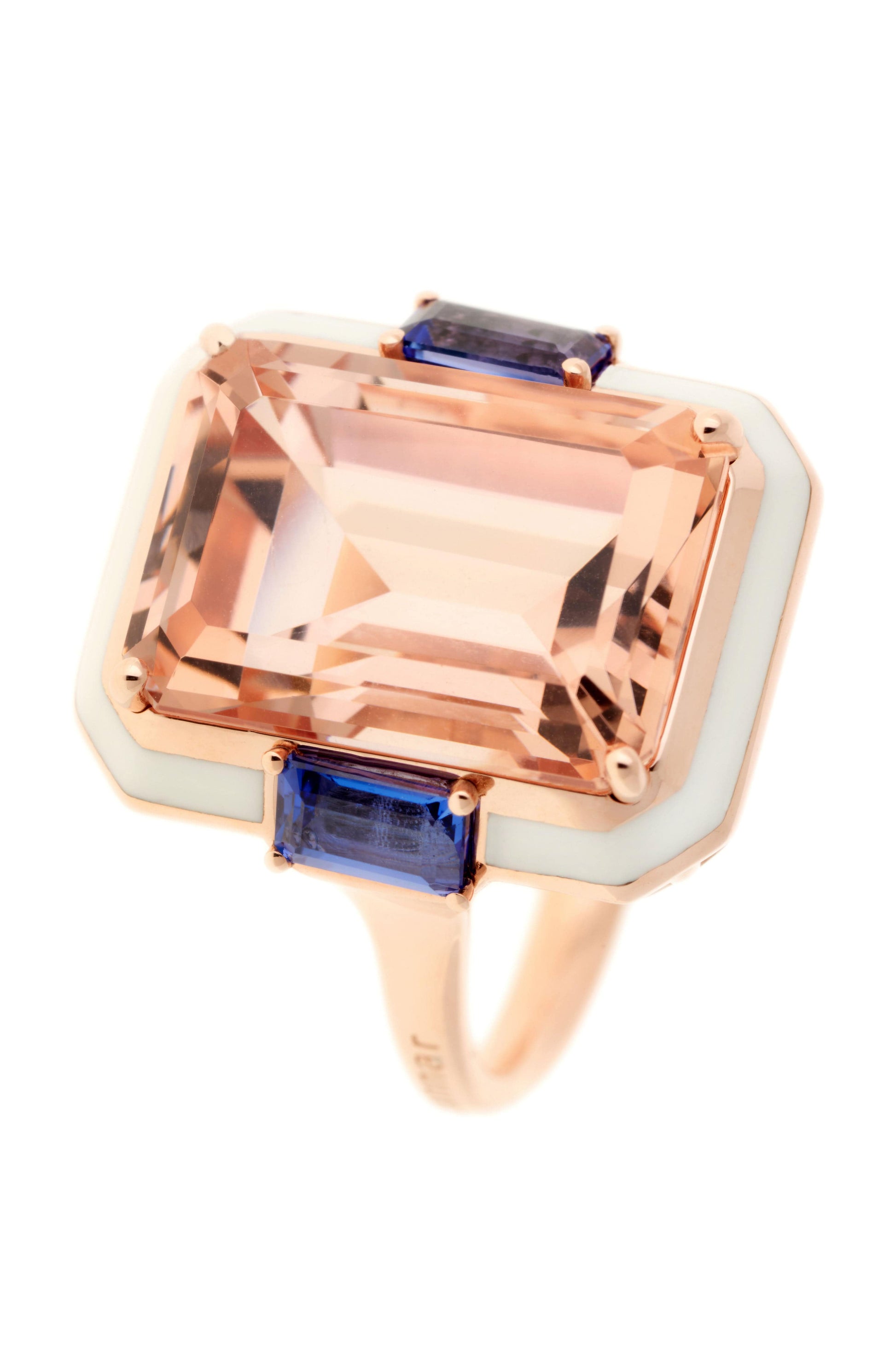 Selim Mouzannar pink gold and white enamel gemma ring set with morganite and tanzanites.